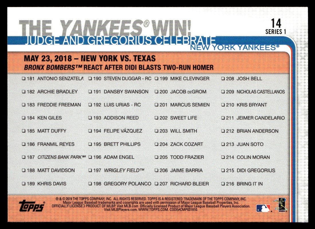 2019 Topps The Yankees Win! Aaron Judge/Didi Gregorius #14