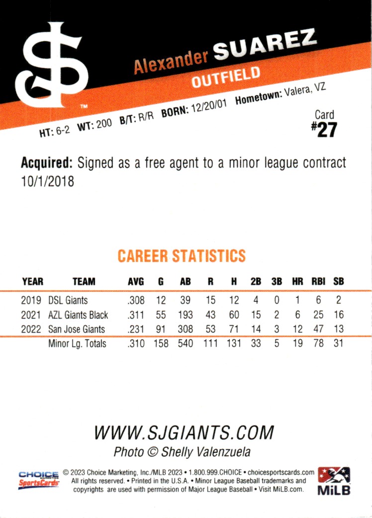 2023 Alexander Suarez Choice Minor League Rookie Card RC San Jose Giants