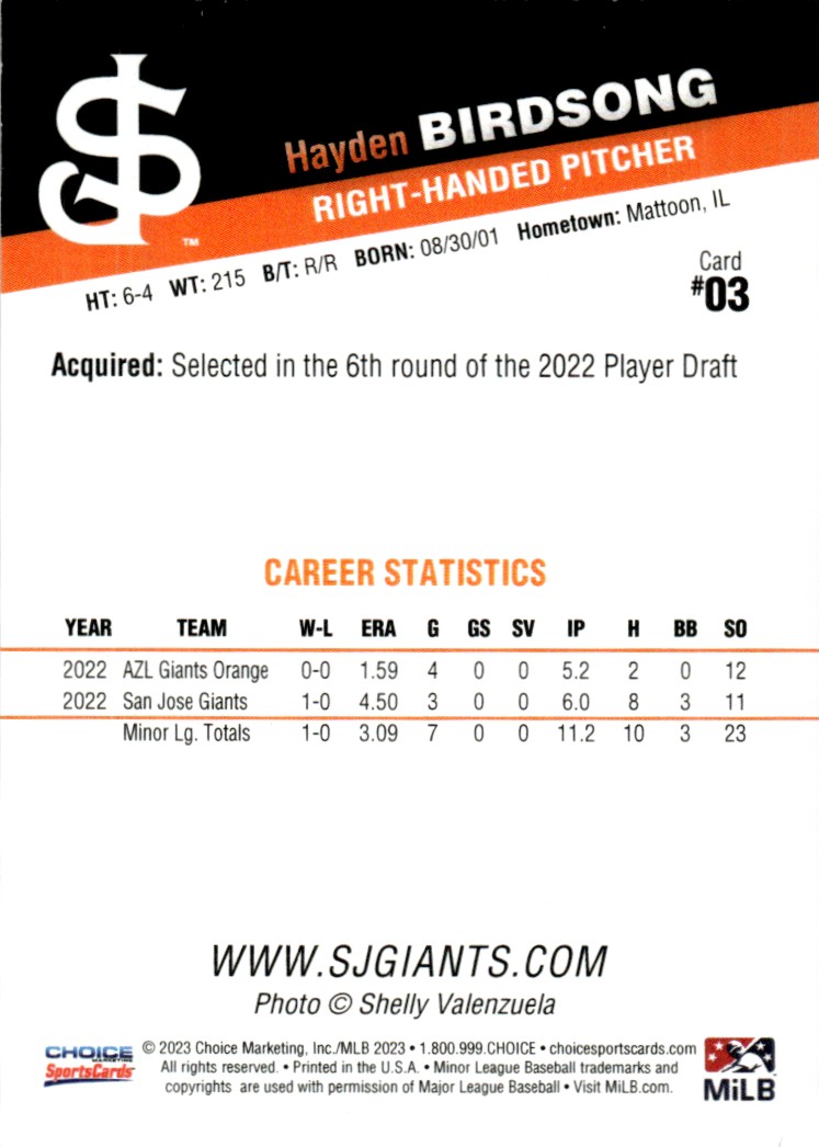 2023 Hayden Birdsong Choice Minor League Rookie Card RC San Jose Giants