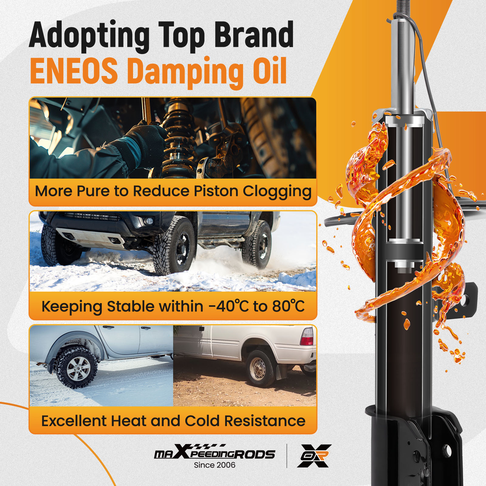 1. Die Strebenbaugruppe verwendet japanisches ENEOS-Marke-Dämpfungsöl, um sicherzustellen, dass der Stoßdämpfer stabile Funktion bei -40 ℃ ~ 80 ℃ aufrechterhalten kann.