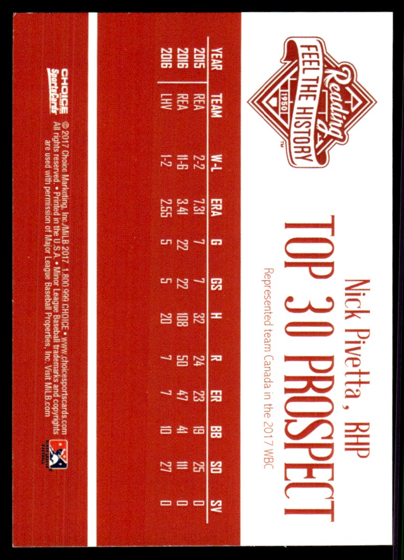 2017 Nick Pivetta Choice Minor League Rookie Card Reading Phils Top Prospects