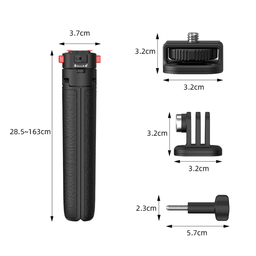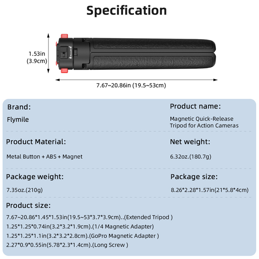 l Size: 19.5~53x 3.7x 3.9cm(Extended Tripod ), 3.2x 3.2x 1.9cm(1/4 Magnetic Adapter), 3.2x 3.2x 2.8cm(GoPro Magnetic Adapter ), 5.78x 2.3x 1.4cm(Long Screw )