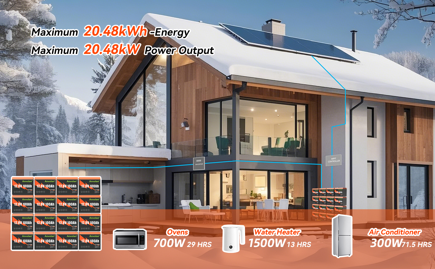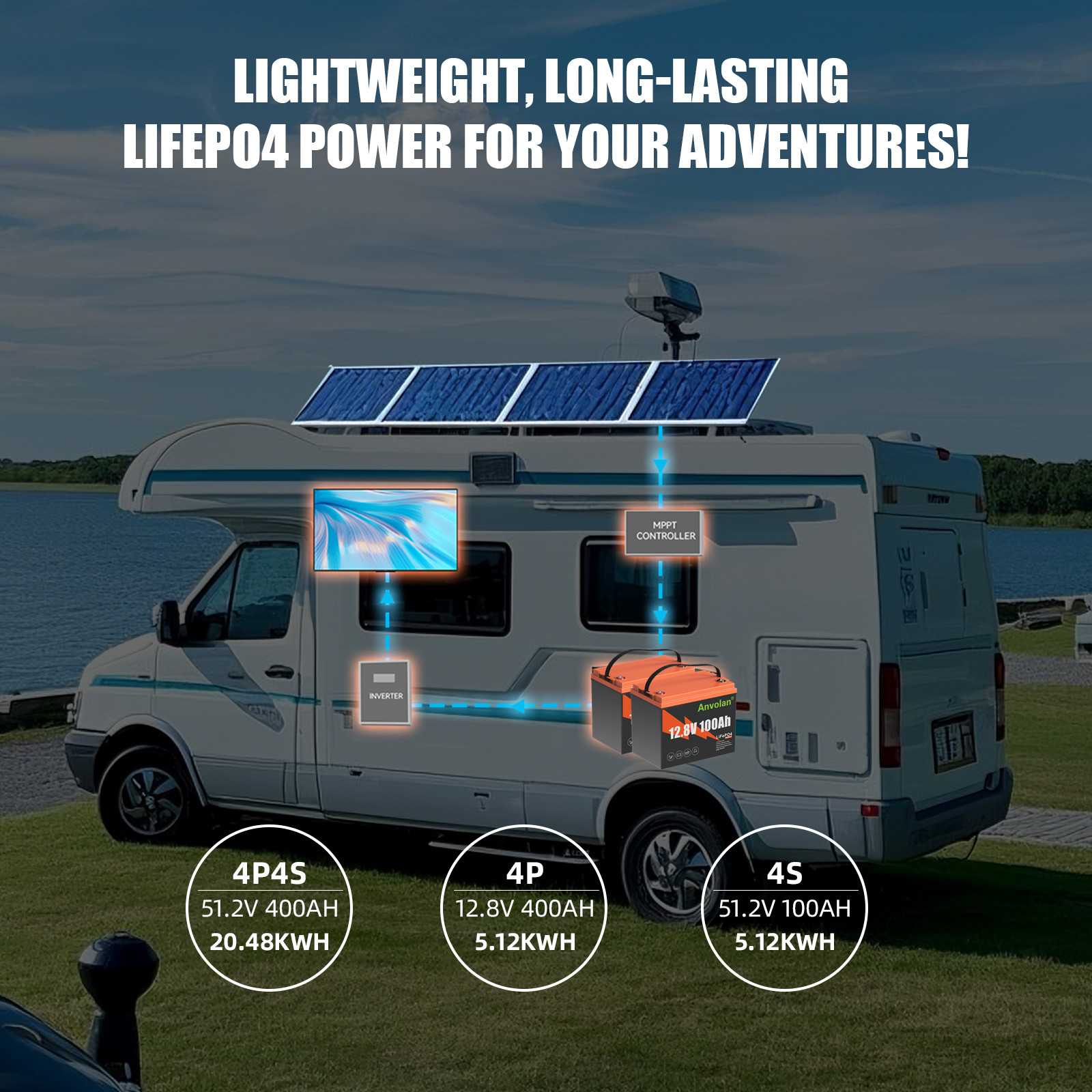 Erweiterbares 20,48 kWh(100AH 12V) Batteriesystem:Die Anvolan LiFePO4 12V Batterien unterstützen eine 4S4P-Konfiguration für bis zu 48V 400Ah, was 20,48 kWh Energie und 20,48 kW Ausgangsleistung ermöglicht. Flexible Systemerweiterung durch Reihenschaltung, Parallelschaltung oder