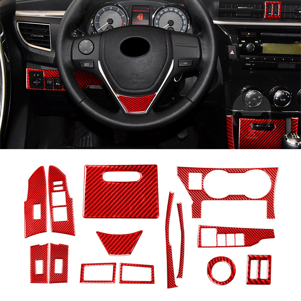 14 Pcs Carbon Fiber Full Set Interior Decoration Cover Trim For Toyota Corolla 2014-2018 Specification: Condition: 100% Brand New Material: Carbon Fiber + Epoxy Coating Color: Red Fitment Type: Direct Replacement Placement on Vehicle: Front Fitment: Fit for Toyota Corolla 2014-2018 Please Note: This item is only suitable for Left-Hand Drive cars. Please kindly check our item description, photos and sizes, make sure this item fit for your car before place an order. Features: 1. Made of high-quality carbon fiber material and epoxy coating with nice textures in looking and touching. 2. Easy Installation with tape attached on the back and you shouldn't need any specialty tools. 3. It will decorate your car in a unique and fashion way. The car will be highly enchanted. And the covers prevent the surface of your car from scratches, dust, keeping it new. Package Included: 1 Set/14 Pcs (as pictures show) 1 x Water Cup Holder Panel Cover 1 x Headlight Switch Panel Trim 1 x Steering Wheel Cover Trim 1 x Central Air Outlet Vent Switch Cover 1 x Cigarette Lighter Panel Trim 1 x Start Ignition Switch Key Hole Cover 2 x Dashboard Air Vent Outlet Cover 2 x Gear Shift Side Panel Trim 4 x Window Lift Switch Button Panel Trim Installation: Step 2 To check the installation area according to the vehicle with this product first and then release the back of tape paper is removed. Step 3 Products are equipped on the vehicle with exactly and use a clean cloth to press evenly is attached. Step 4 Products within 24 hours after installed, please avoid washing your car and touching the water. Notes: 1. No installation instruction included, professional installation is highly recommended. 2. The real color of the item may be slightly different from the pictures shown on website caused by many factors such as brightness of your monitor and light brightness. 3. All dimensions are measured by hand, there may be small deviations.