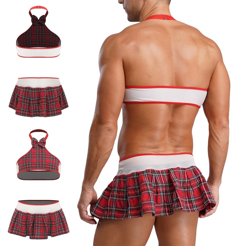 Men Sissy JK School-girl Lingerie Set Plaid Halter Bow Crop Top Pleated Skirts