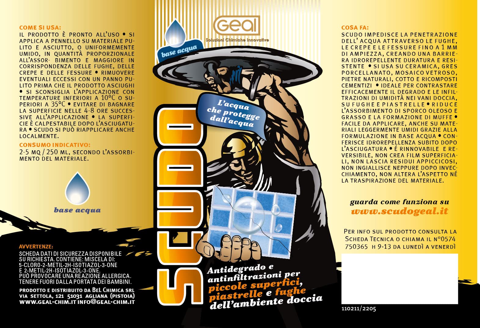 Scudo Geal Anti Infiltrazioni è un protettivo antiumidità contro le infiltrazioni di acqua, specifico per pavimenti e rivestimenti esterni ed esterni di qualunque materiale assorbente (terrazze, balconi, scale, pavimenti, soglie, muretti, balaustre, cimase).