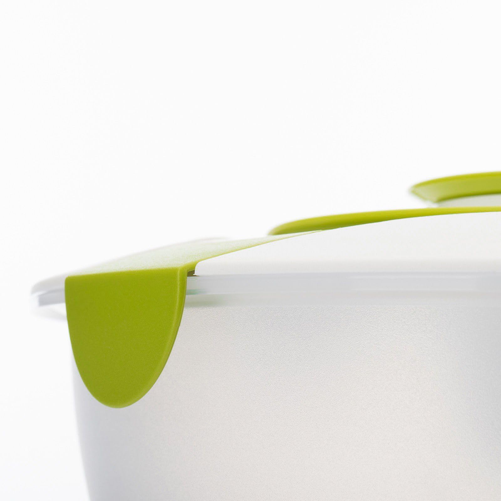 Insalatiera multifunzionale con coperchio, manici integrati e contenitore per il condimento per trasportare, servire e tenere fresca l'insalata, Adatto anche per frutta e dessert - Grande ciotola trasparente (Volume: 6,5 litri) con coperchio per preparare e contenere grandi quantità di insalata, Coperchio facile da chiudere con le 4 alette di blocco, Manici grandi e stondati sul coperchio per un facile trasporto - Insalata sempre croccante: Piccolo contenitore per condimenti rimovibile con coperchio verde mela (Volume: 0,3 litri) per condire l'insalata sul momento - Made in Germany: Facile da lavare a mano, Lavabile in lavastoviglie - Contiene: 1x Westmark Insalatiera, Praktika, 6,5 litri, Dimensioni: 30,5 x 30,5 x 18,8 cm, Peso: 548 g, Materiale: Plastica (PP, PE), Colore: Trasparente/Bianco/Verde, 2422227A.