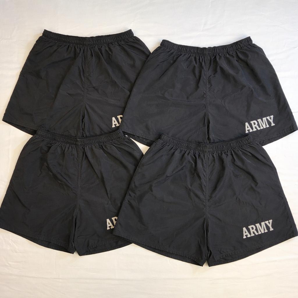 Lot of 4 U.S. Army style PT/PFU physical fitness running shorts/trunks in black with reflective/silver ARMY print (print placement may vary).