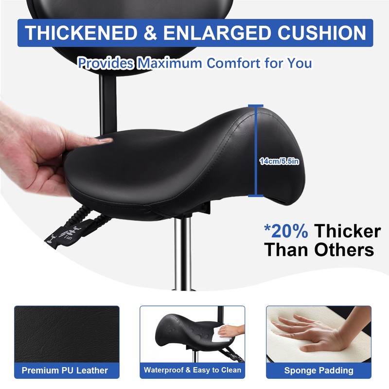 Ergonomic Support: With a comfortable saddle seat, softer, thicker cushion, and adjustable backrest support for lower back and hips, this stool's ergonomic curved design promotes proper sitting, reducing fatigue and strain in your body