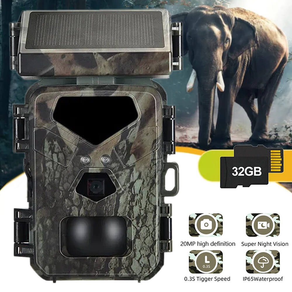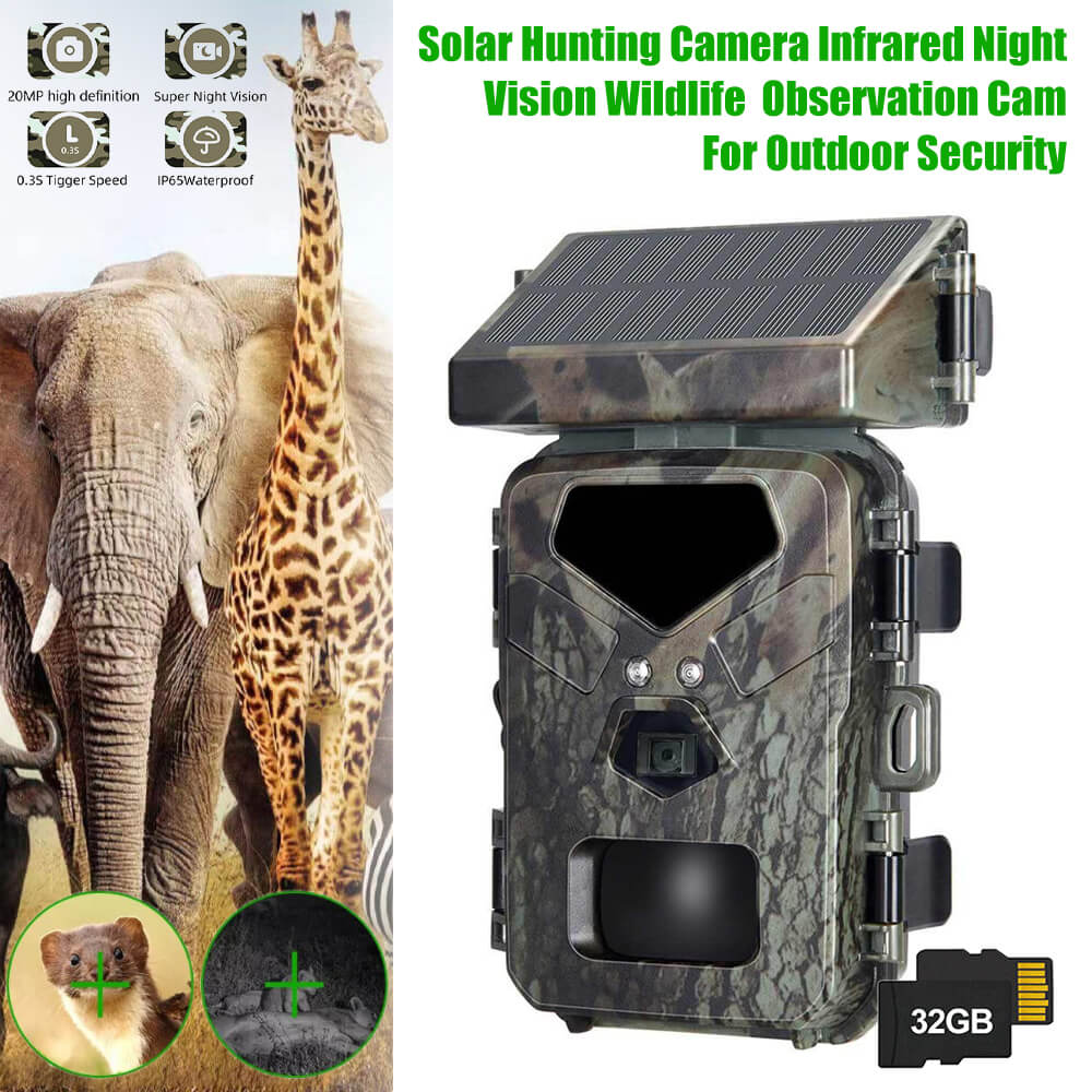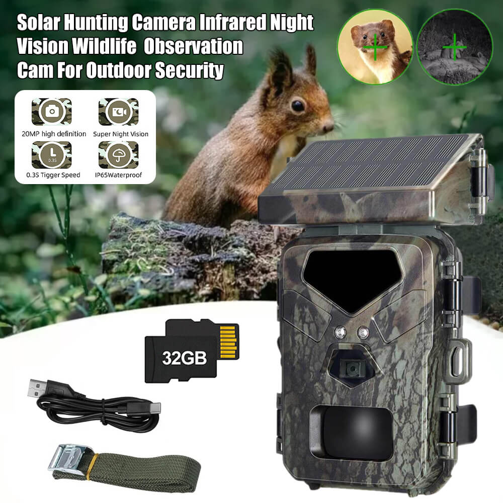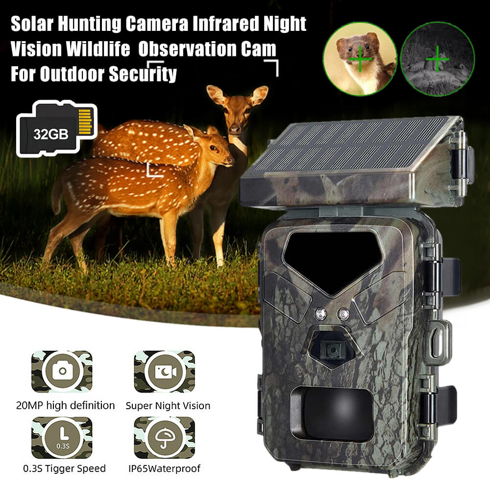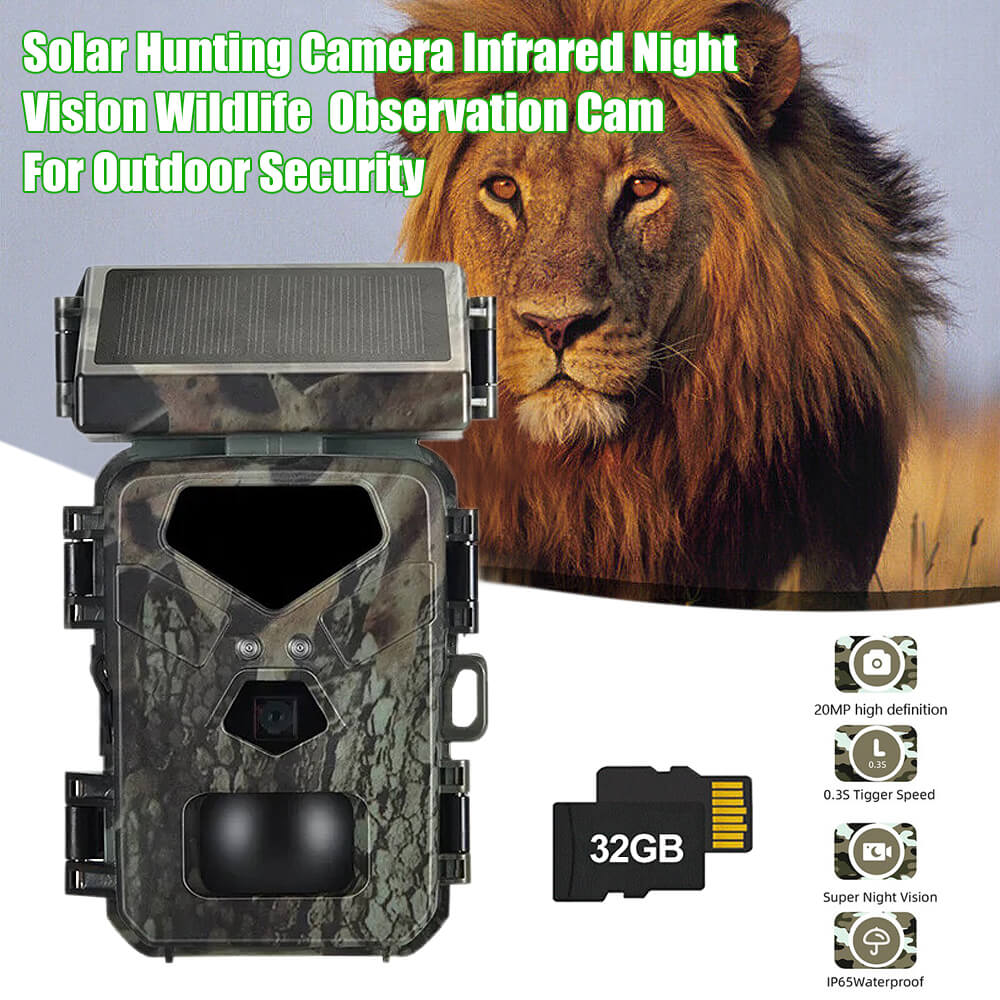 Solar Panel Hunting Camera Infrared Induction Automatic Monitoring Wildlife Trap Trail Camera 20MP 1080P Video Photo Recorder. The integrated solar panel technology means the days of being a slave to your trial camera's battery life are over. The internal lithium battery is powered by the solar panel, meaning potentially unlimited battery life is within reach.