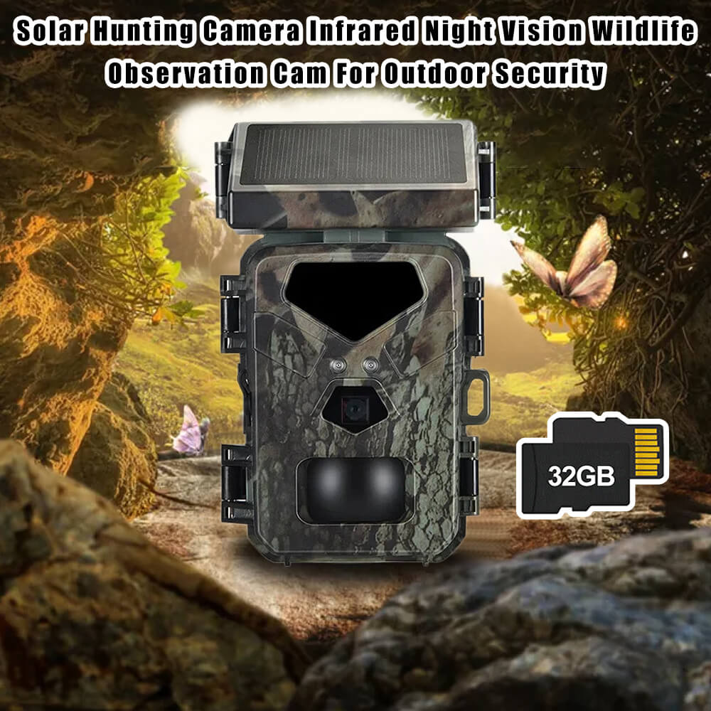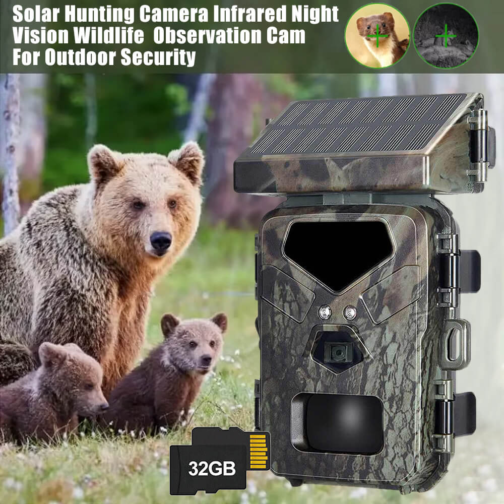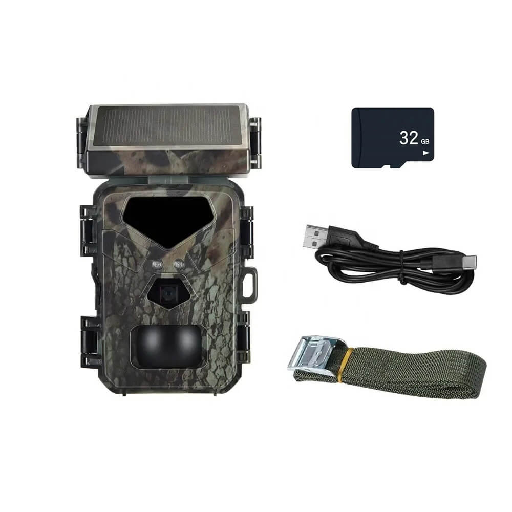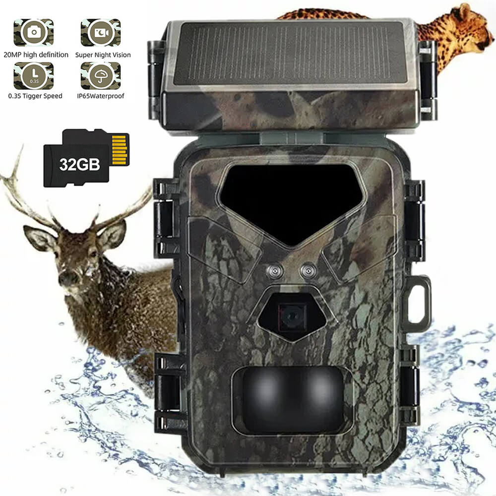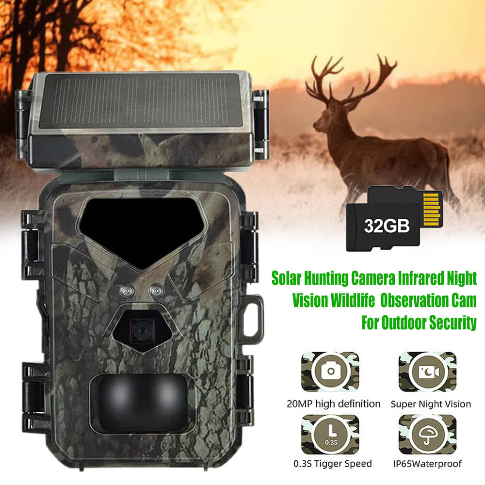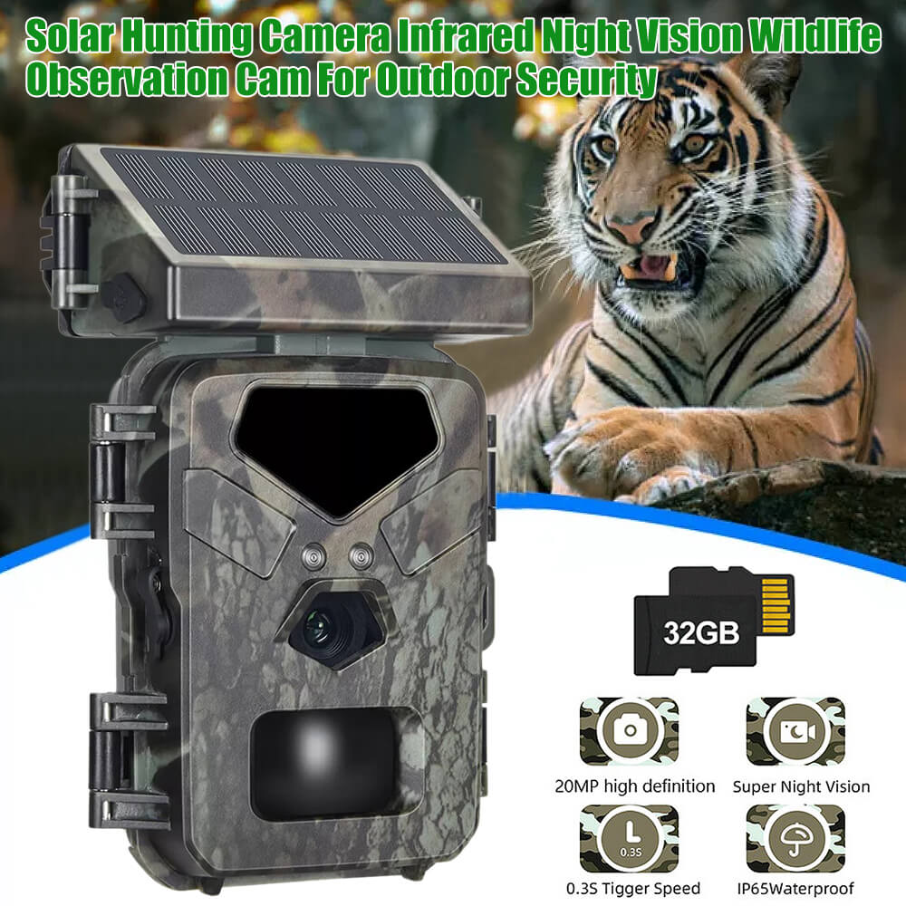 Solar Panel Hunting Camera Infrared Induction Automatic Monitoring Wildlife Trap Trail Camera 20MP 1080P Video Photo Recorder. The integrated solar panel technology means the days of being a slave to your trial camera's battery life are over. The internal lithium battery is powered by the solar panel, meaning potentially unlimited battery life is within reach.