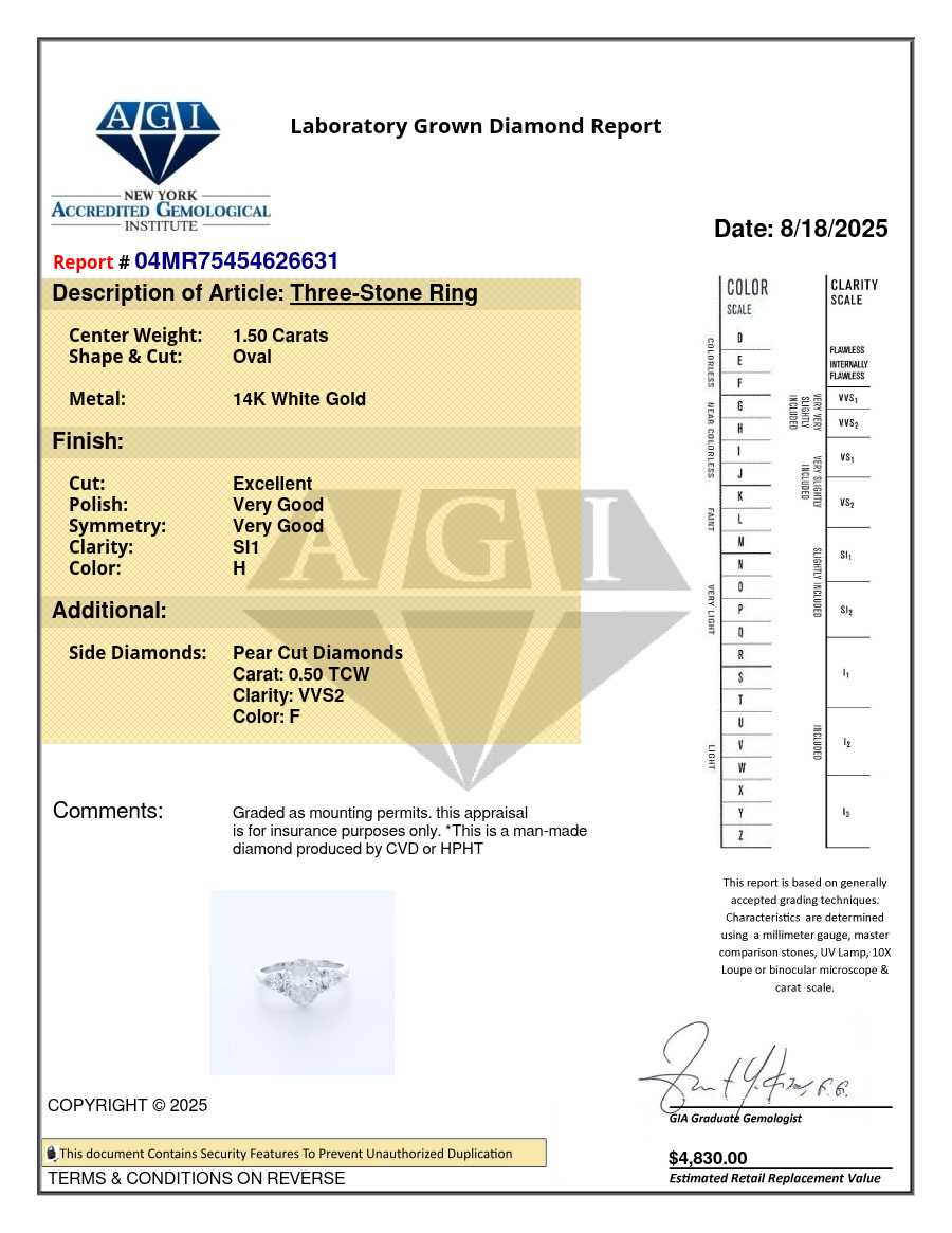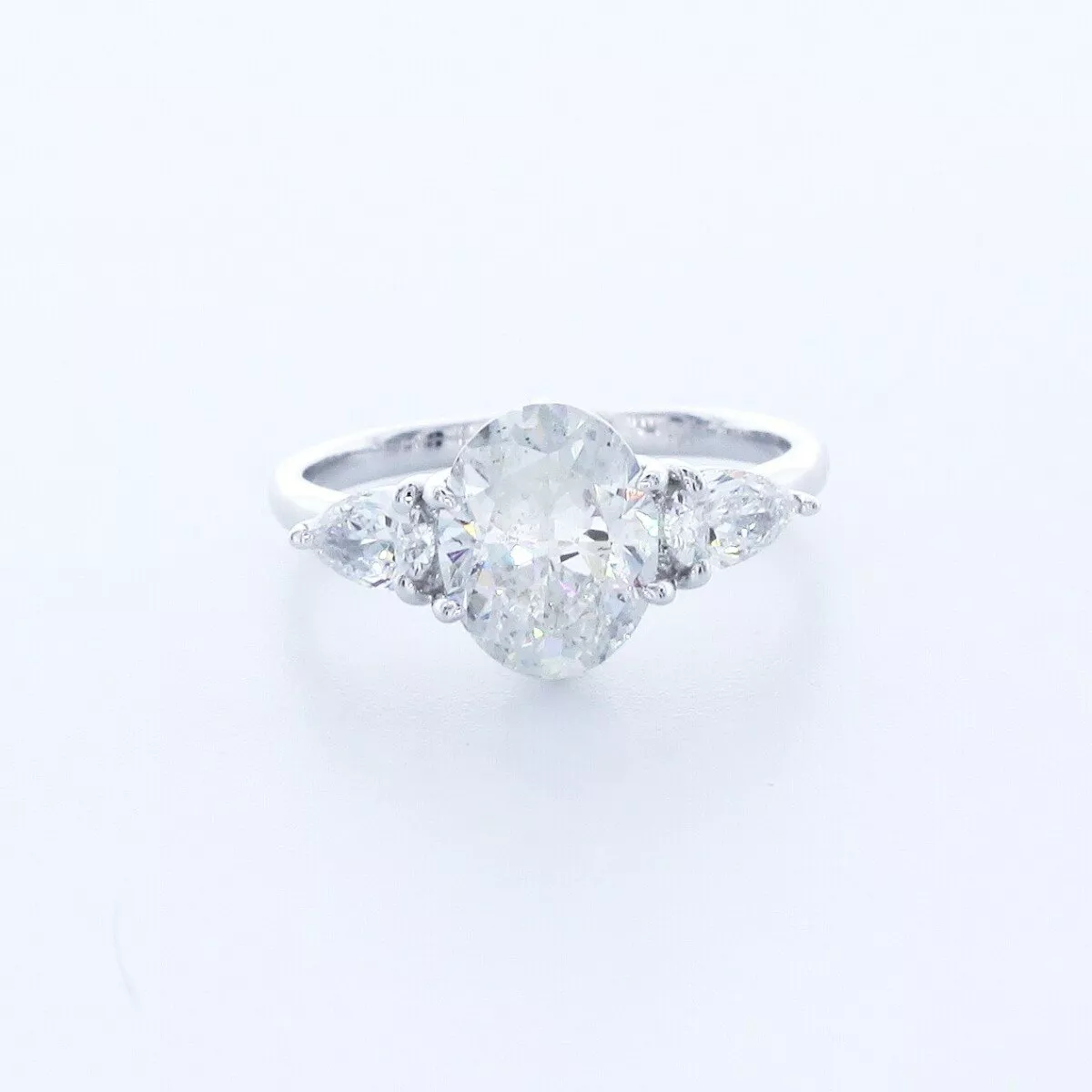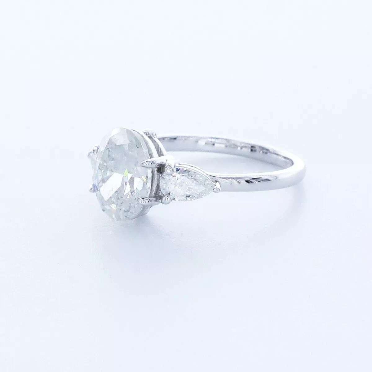 Solid 14K White Gold Three Stone Engagement Ring AGI Cert 2 CT Oval Lab-Grown Diamond H SI1
