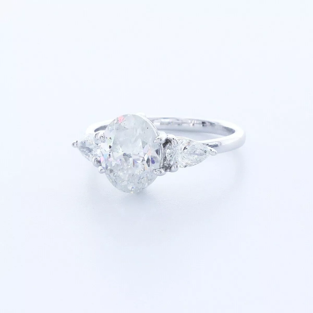 Celebrate love's journey with this exquisite three-stone engagement ring, a stunning symbol of your past, present, and future. Designed with meticulous craftsmanship, the oval lab-grown diamond sits elegantly in a four-prong basket setting, radiating brilliance. Flanked by delicate pear-shaped stones in a graceful three-prong setting, this ring captures timeless elegance. Ideal for proposals or to elevate an anniversary, it's a heartfelt investment that embodies joy and sophistication, promising durability and beauty for a lifetime of cherished moments.