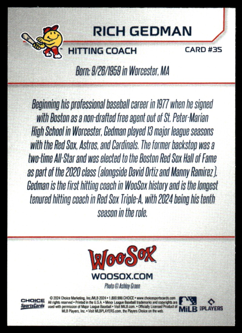 2024 Rich Gedman Choice Minor League Rookie Card Worcester Woo Red Sox