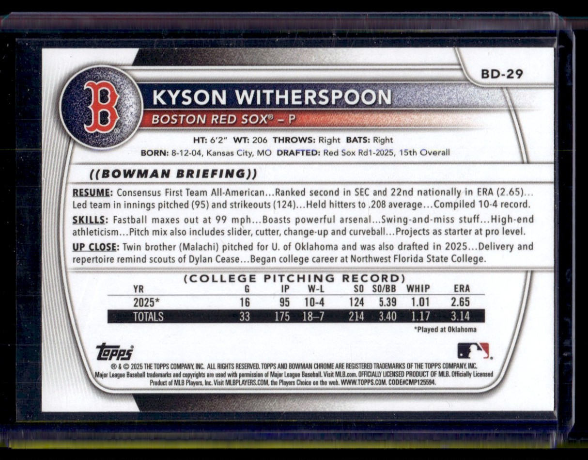| 2025 Bowman Draft Gold Border Kyson Witherspoon 28/50 Boston Red Sox #BD-29 |