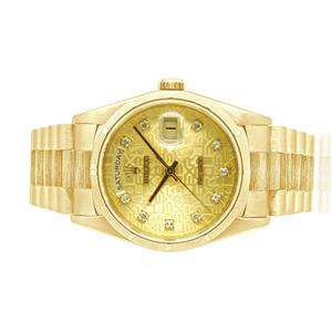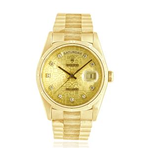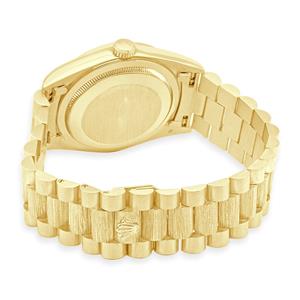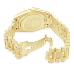 Case: 36mm 18k yellow gold case, yellow gold fluted bezel, screw down crown