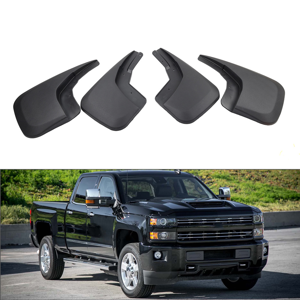 Wheel Mud Flaps Splash Guards For Chevrolet Silverado 1500 2500 3500 Features: 1. Rugged and sporty mud flaps increase cool & sports elements perfectly conform to the contours of your vehicle. 2. Made from impact resistant all-weather PP + TPO material, which is corrosion-resistant and scratches, sturdy and durable and not easily damaged. 3. The mud guards built for full tread coverage of factory tires to protect the vehicle and pedestrians from mud and other flying debris thrown into the air by the rotating tire. Specification: Condition: Brand New (Never Been Used or Installed) Material: PP + TPO Color: Black Fitment Type: Performance/Custom Placement on Vehicle: Front, Rear, Left, Right Fitment: For Chevrolet Silverado 1500 2014-2018 For Chevrolet Silverado 2500/3500 2015-2018 For models without fender flares. Not fit for the models with dually wheels. Please kindly check our item description, photos and sizes, make sure this item fit for your car before place an order. Packing Included: 4Pcs Mud Guards Notes: 1. All dimensions are measured by hand, there may be small deviations. 2. No installation instruction included, professional installation is highly recommended. 3. These are aftermarket mud flaps, the pre-drilled holes may not line up with the factory drilled ones. In that case, re-drill will be required. 4. The real color of the item may be slightly different from the pictures shown on website caused by many factors such as brightness of your monitor and light brightness.