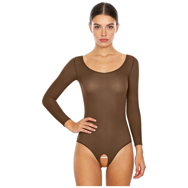 Women Hollow-out Crotch Bodysuit Crew Neck Long Sleeve Glossy Leotard Swimwear