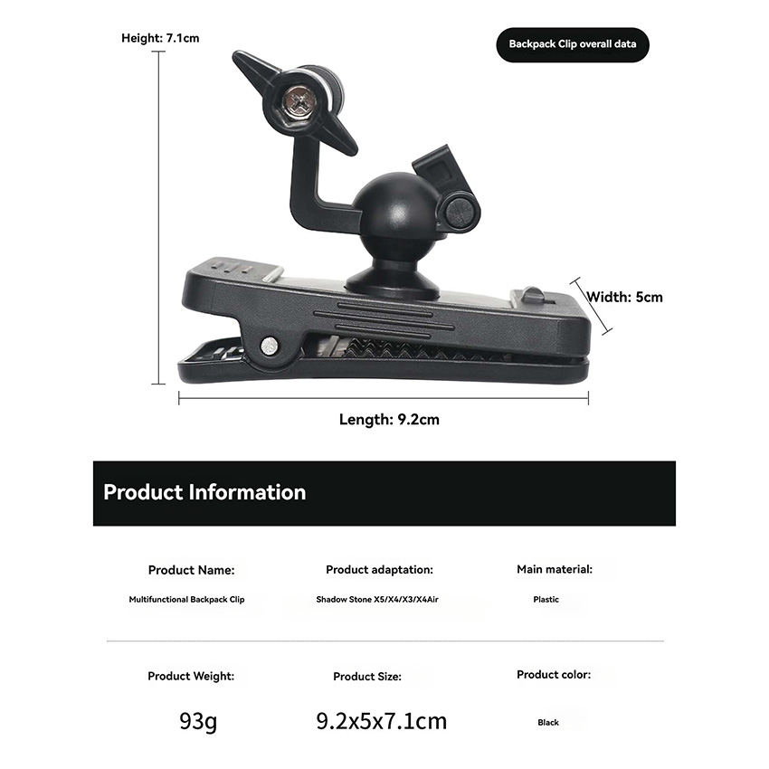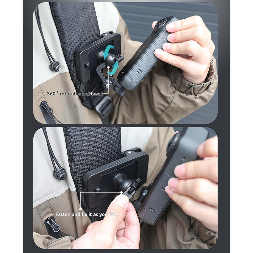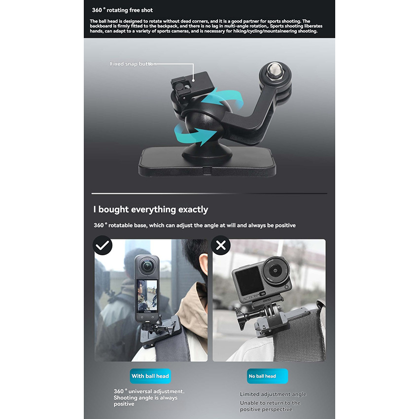 l Ball-head design rotates seamlessly for unobstructed angles, the perfect companion for action photography. Securely attaches to backpacks with a stable backing plate, offering smooth multi-angle rotation without snagging