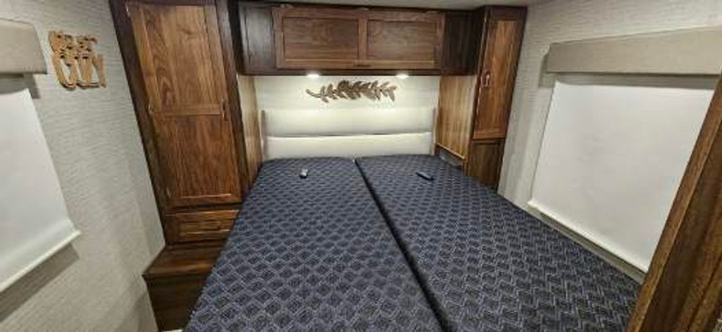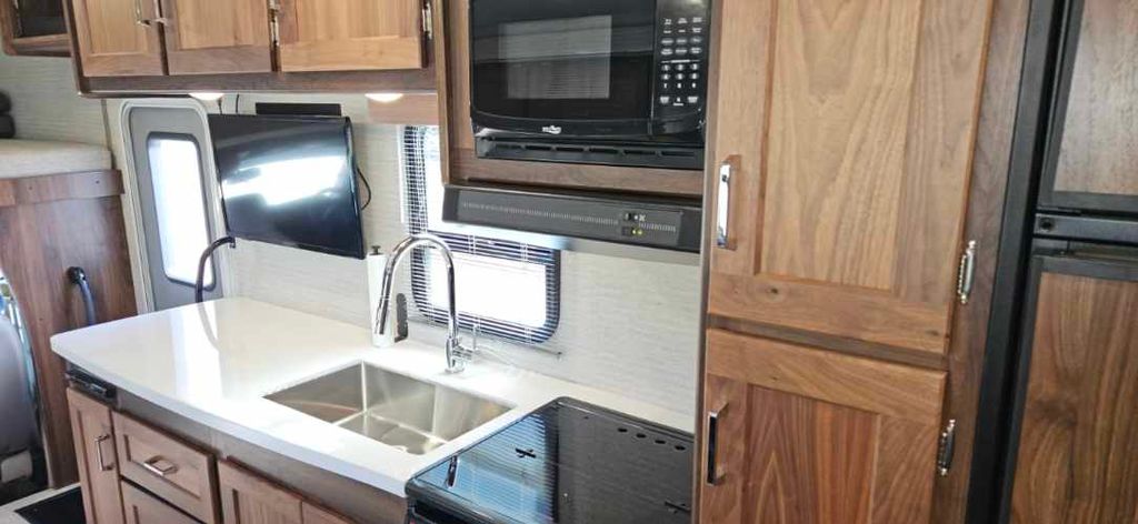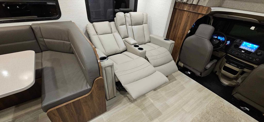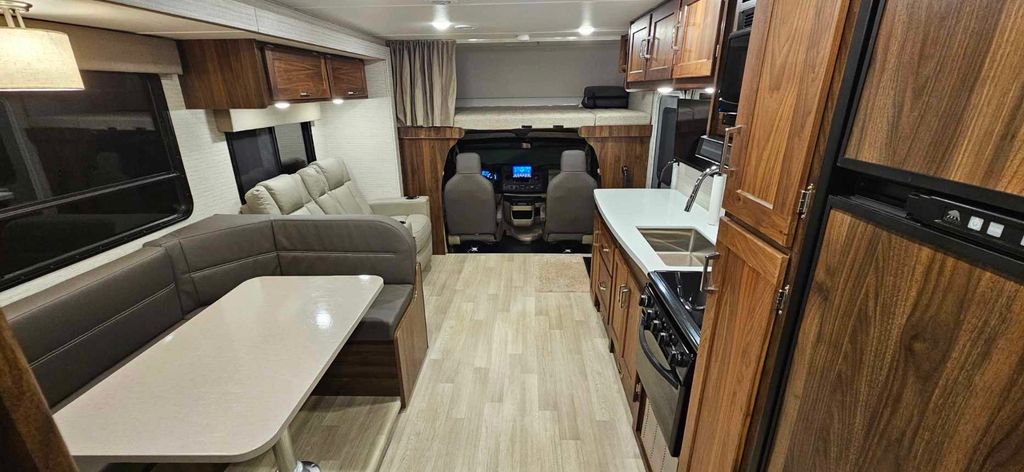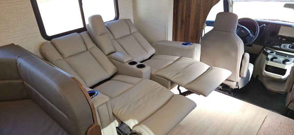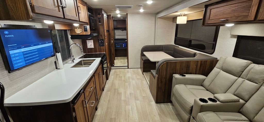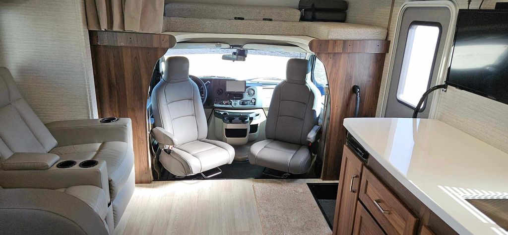 The driver-centric cab offers excellent visibility, comfortable seating, and integrated controls to keep long drives smooth and stress-free. Behind the cab, the open-layout living area welcomes you with abundant natural light, a slide-out that expands the interior space, premium upholstery, and an entertainment center perfect for relaxation at the end of the day.