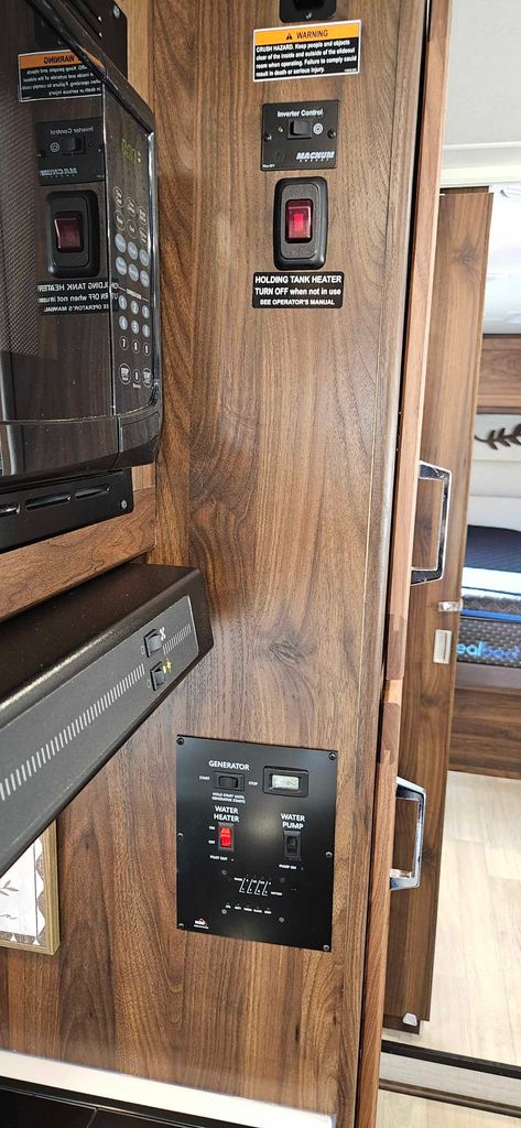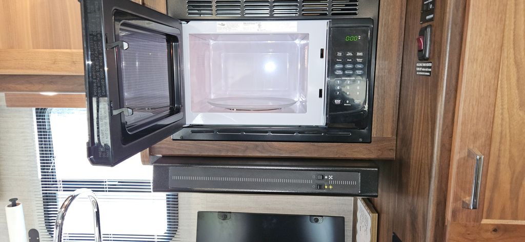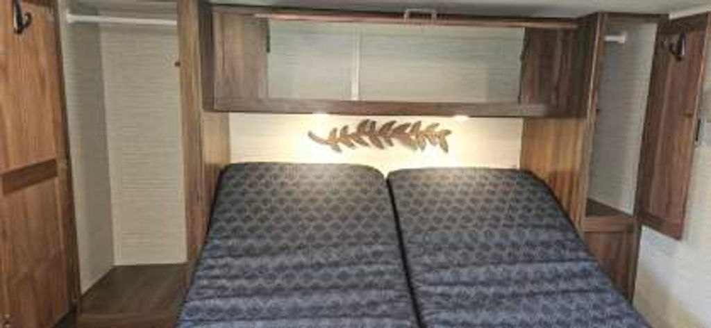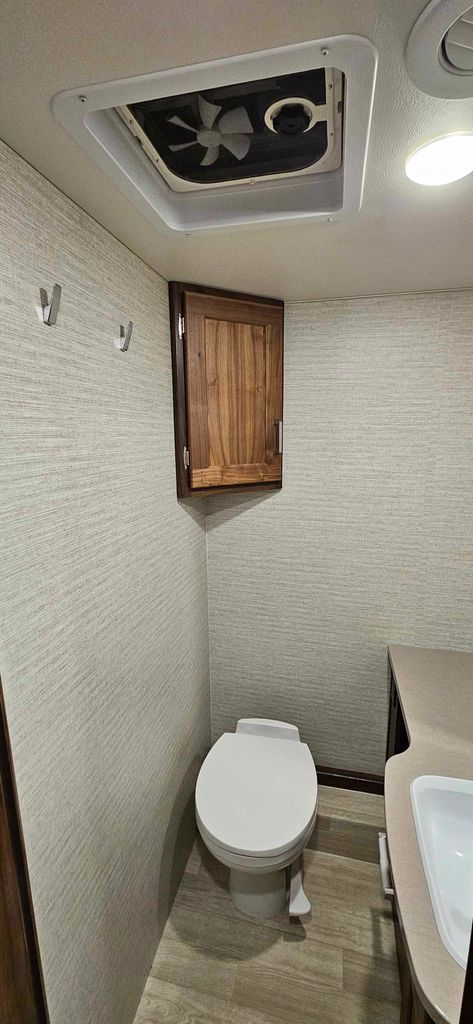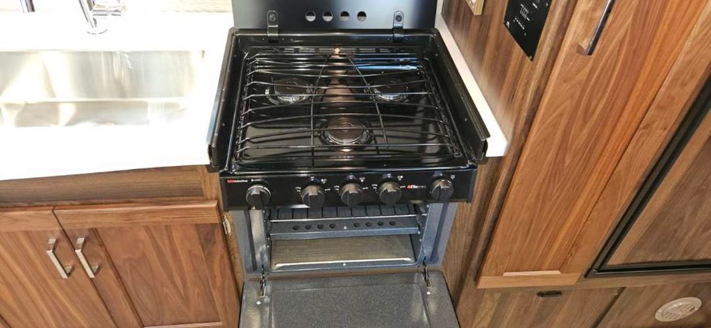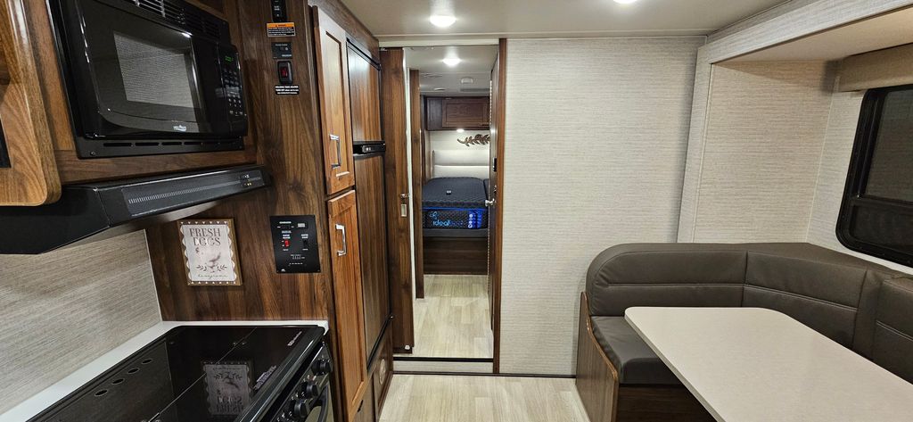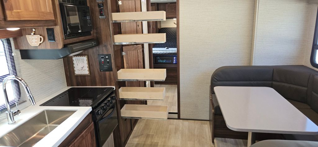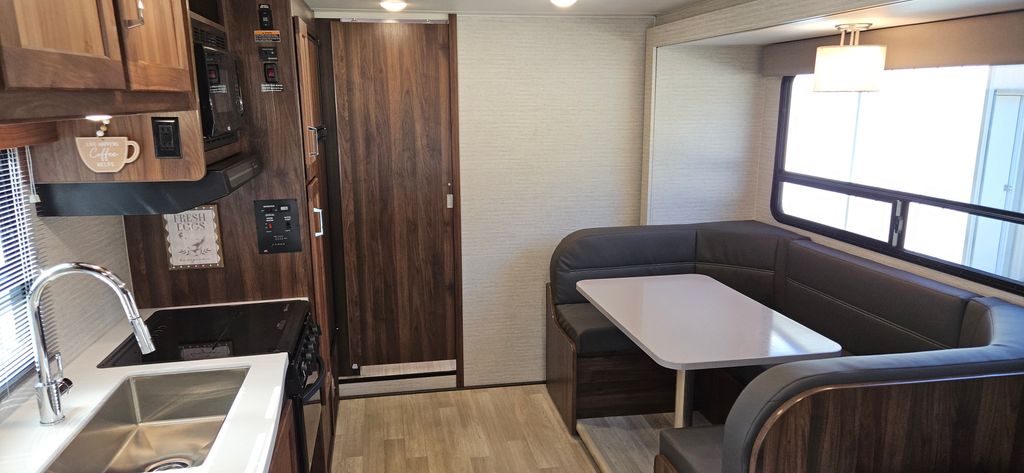 The fully equipped kitchen makes meal prep simple with solid surface countertops, a three-burner cooktop, microwave, refrigerator, and generous storage space. A booth dinette not only provides a comfortable dining area but also converts to additional sleeping space when needed.