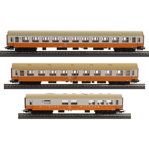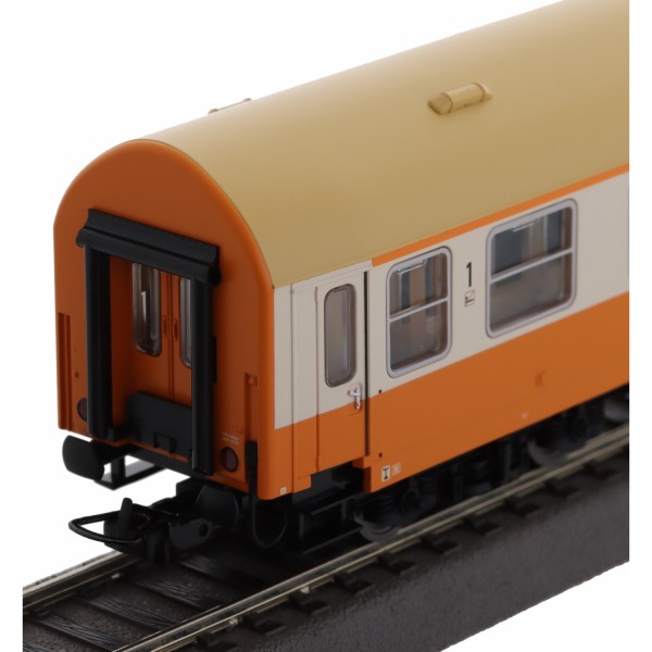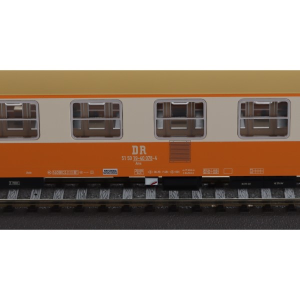 Das Set besteht aus drei detailliert gestalteten Personenwagen mit der klassischen Städteexpress-Lackierung in orange-beige. Die fein umgesetzte Bedruckung mit DR-Kennung, Fahrzeugnummern und Kurswagenbeschriftung macht diese Wagen zu echten Schmuckstücken auf der Anlage. Jeder Wagen ist mit einer Inneneinrichtung ausgestattet – für ein realistisches Gesamtbild bei Tag- und Nachtbetrieb.