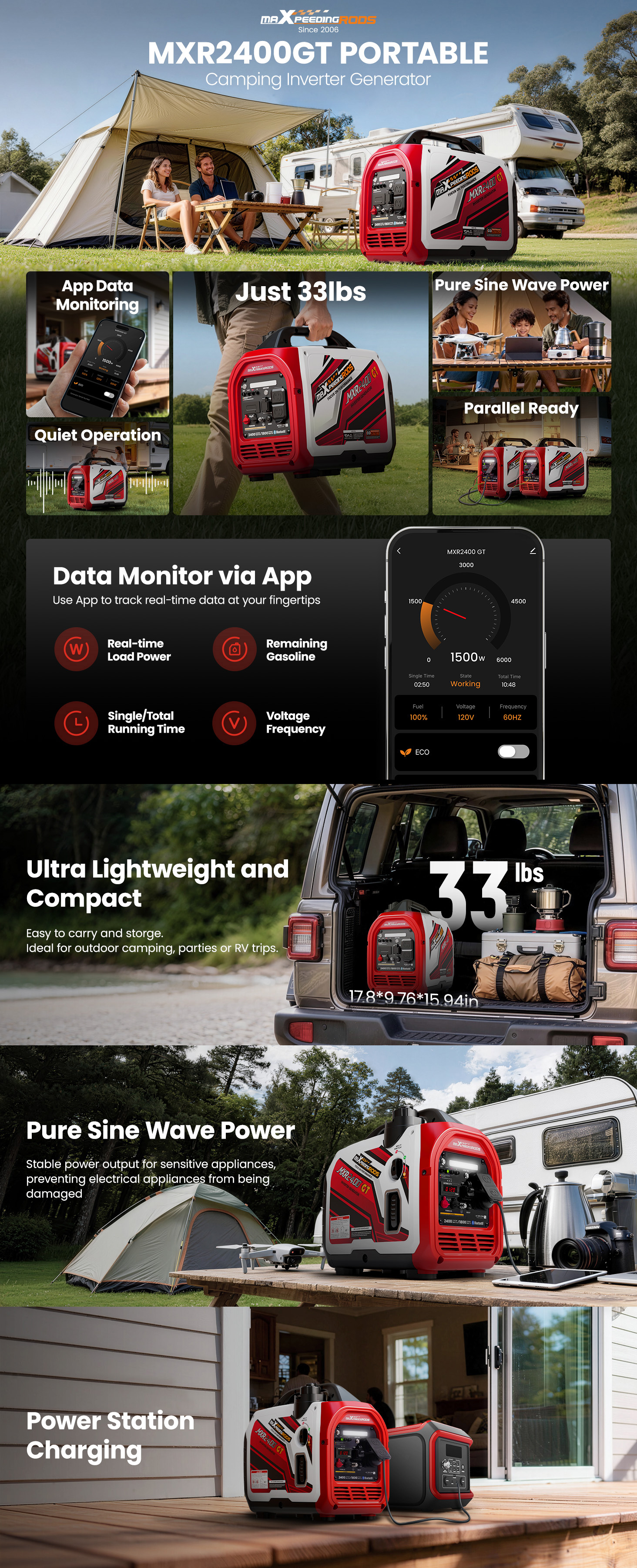 【Lightweight & Compact】At just 33 lbs, this compact-sized generator is easy to carry and fits effortlessly in car trunks, RV storage, or home corners.