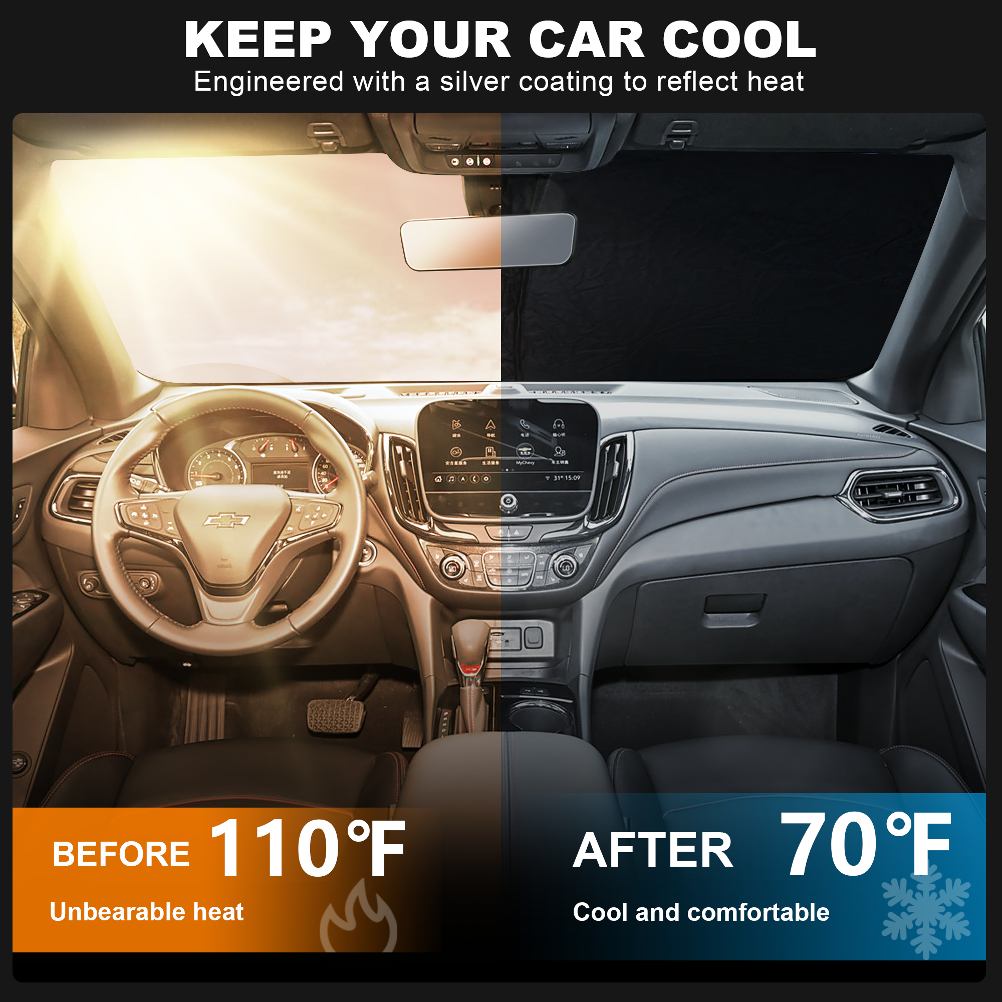 Keeps Cool —— Made of premium 210T reflective polyester to reduce heat buildup up to 40°F, it will block 99% of damaging UV rays. Keep your car cooler.