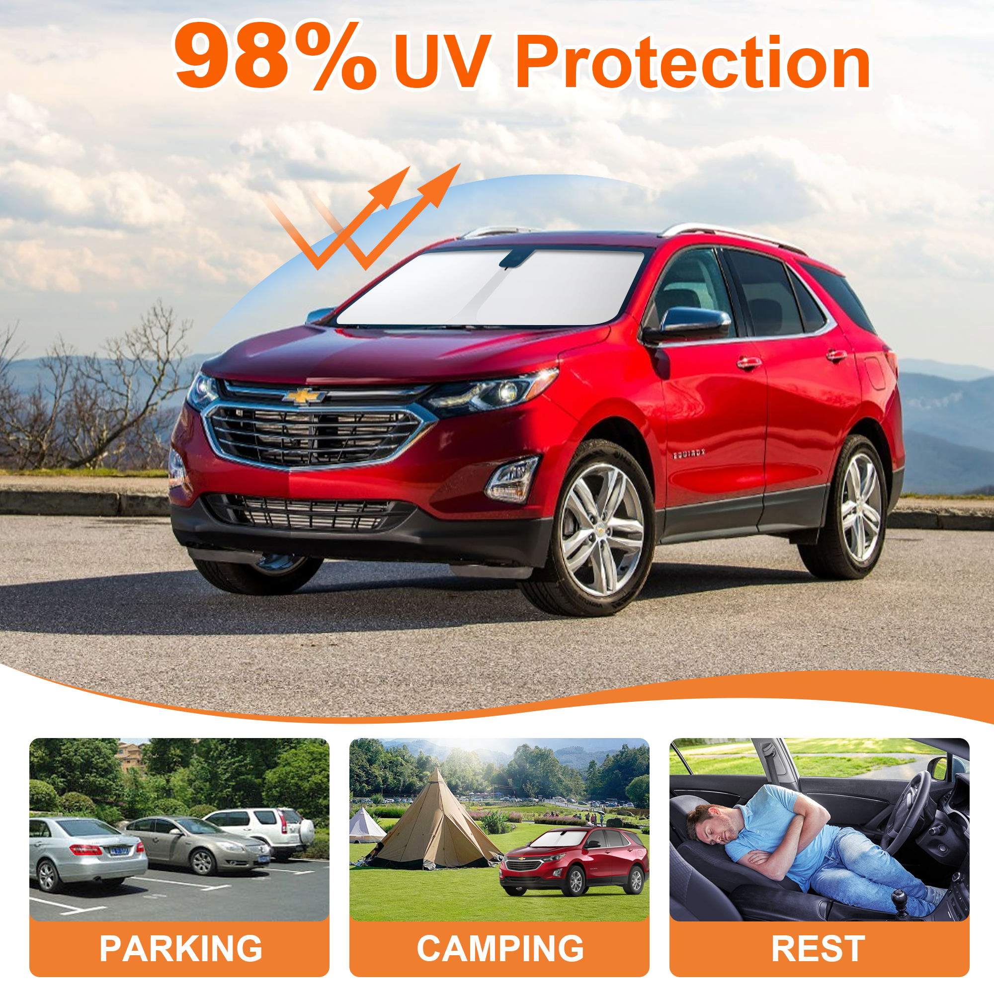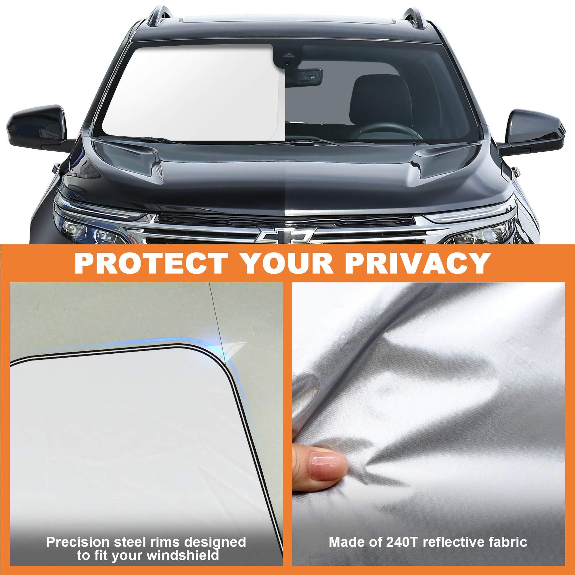 Upgraded Design —— We use a double layer of heat shield fabric to keep out the sun. The first layer is premium 210T reflective polyester and the second layer is high-quality fabric. Double insulation, and double protection. The best shade and insulation on the market.