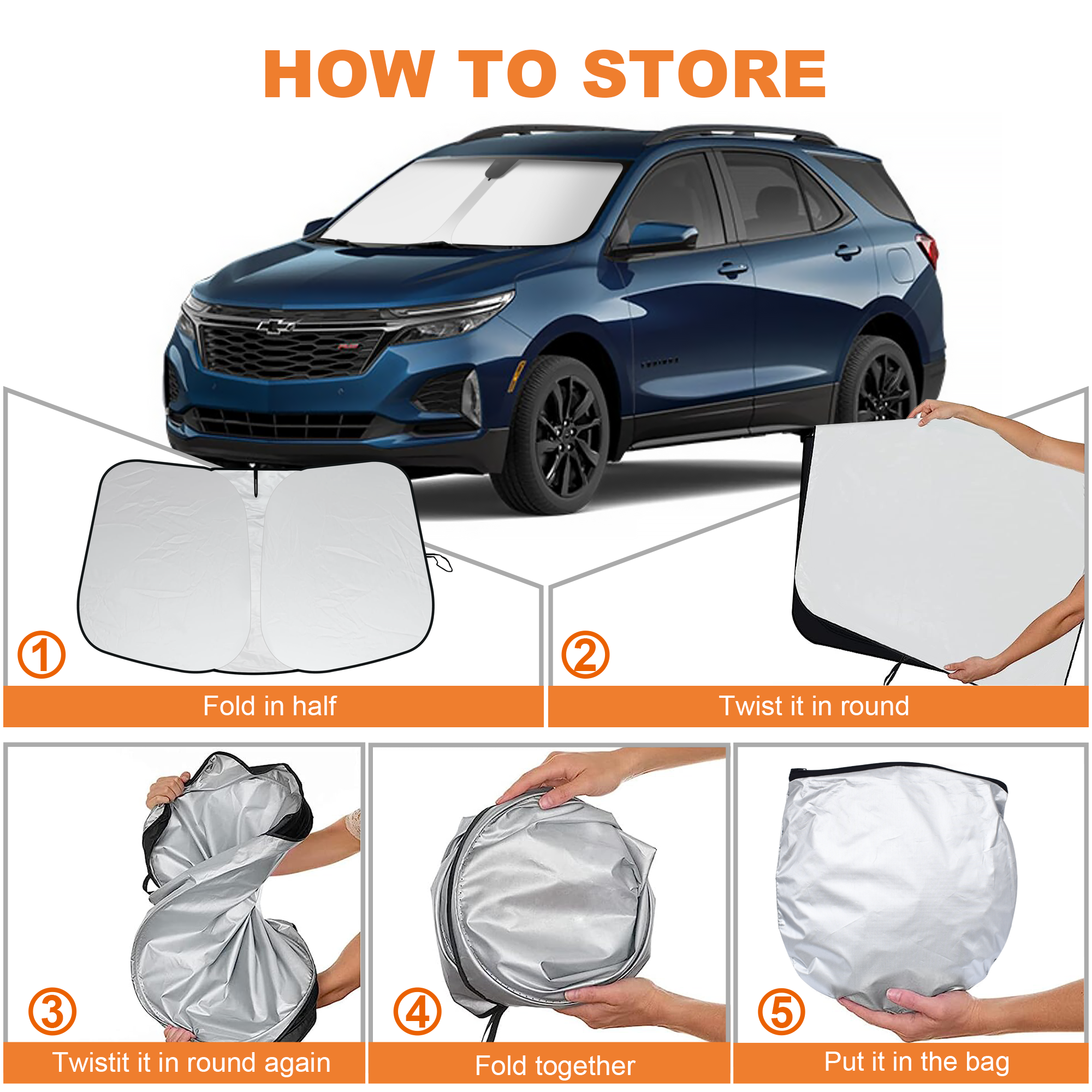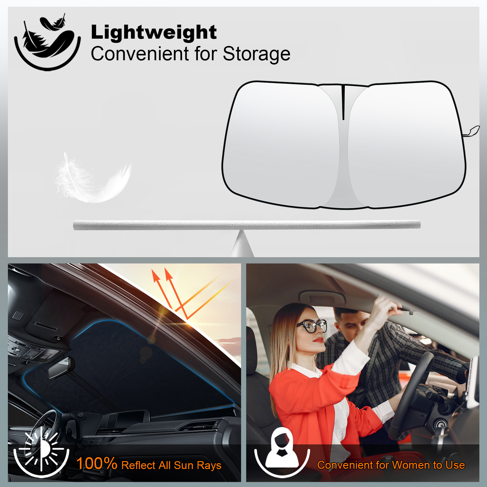 Easy to use and store —— The shade can be easily popped up and folded in seconds for everyday use. You can easily tuck the sunshade into your door pocket.