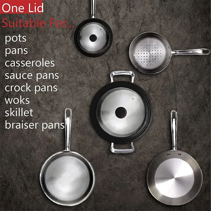 Universal kitchen cookware lid: 1.Our lid only needs one that fits three models and keep your kitchen concise and orderly. No more going through the hassle of keeping and storing multiple lids.