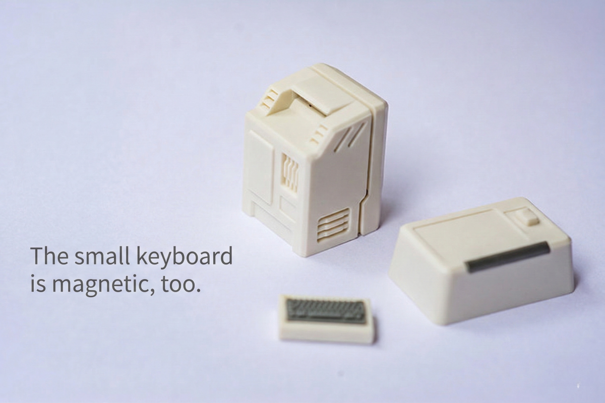 Magnetic Miniature Keyboard (Fidget Friendly!): The tiny keyboard isn't just for show—it attaches magnetically to the monitor base! You can detach it and snap it back on, making it a highly satisfying desk fidget toy.
