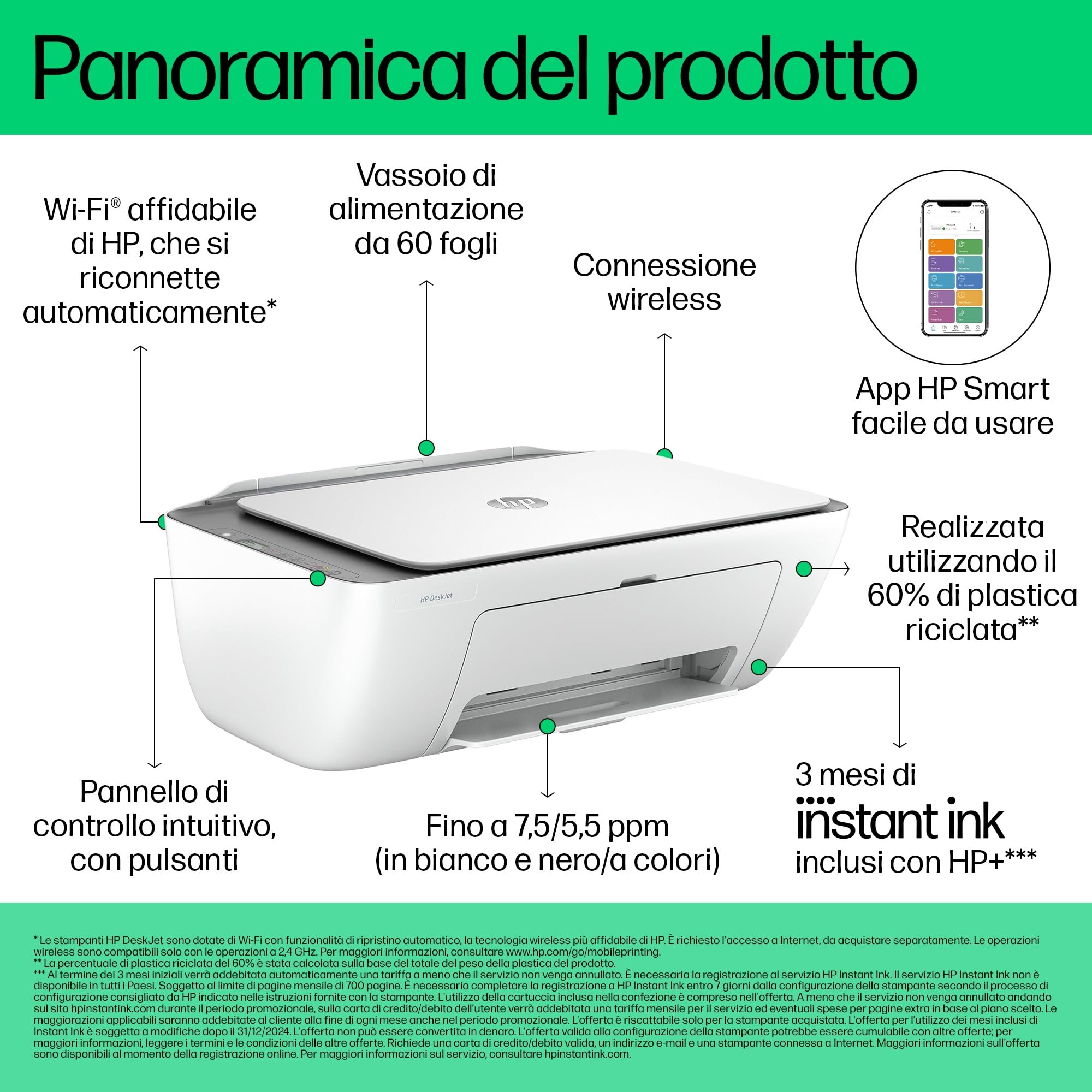 CONNETTIVITÀ: è possibile stampare da pc, smartphone e tablet con l'app HP Smart che si connette ai dispositivi attraverso il Wireless Dual Band, Wi-Fi Direct, AirPrint e Mopria; Cavo USB non incluso