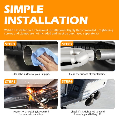 Maintenance tips: please routinely clean off the debris, cement, oil, dust and dirt on the surface or the interior of the exhaust tips since good maintenance ensures a longer service life of exhaust tips (NOTE: Professional installation would be highly recommended)