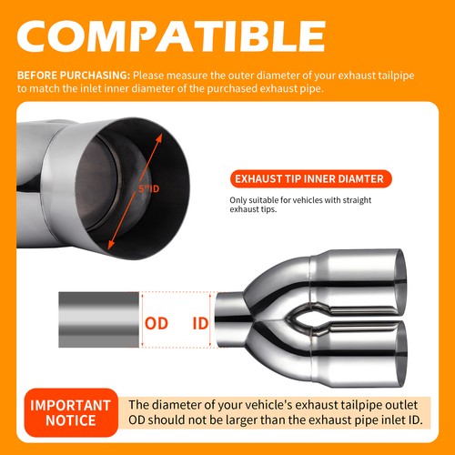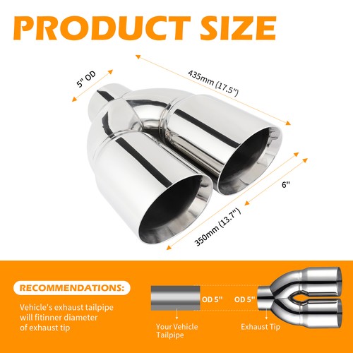 Specifications • 100% Brand New Double Wall Tip • Material:304 stainless steel • Inlet tip diameter: 5" Inlet • Outlet tip diameter:Dual 6" Outlet • Total length: 17.12"