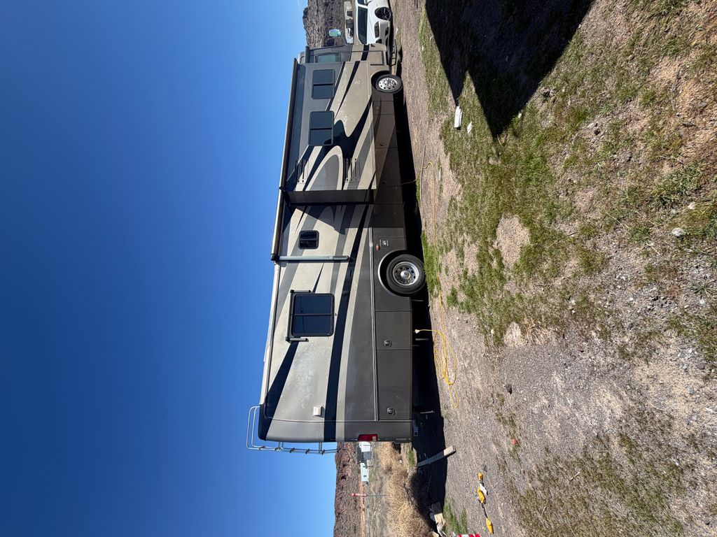 Key Specifications & Features Engine & Chassis: 400 HP Cummins ISL Engine, Allison 3000 MH 6-speed transmission, and a 10,000 lb. hitch. Dimensions: Approximately 40 feet long, 100-gallon fuel tank, 100-gallon fresh water tank. Interior Features: Triple slide-out floorplan, often featuring a bedroom with a rear wardrobe, washer/dryer, and a 4-door refrigerator with icemaker. Comfort & Luxury: Solid surface countertops, tile flooring, leather cockpit seats (6-way power pilot seat), and a 2000-watt inverter. Exterior: Side-hinged baggage doors, full-pass-through storage, and 8.0 kW Quiet Diesel generator.