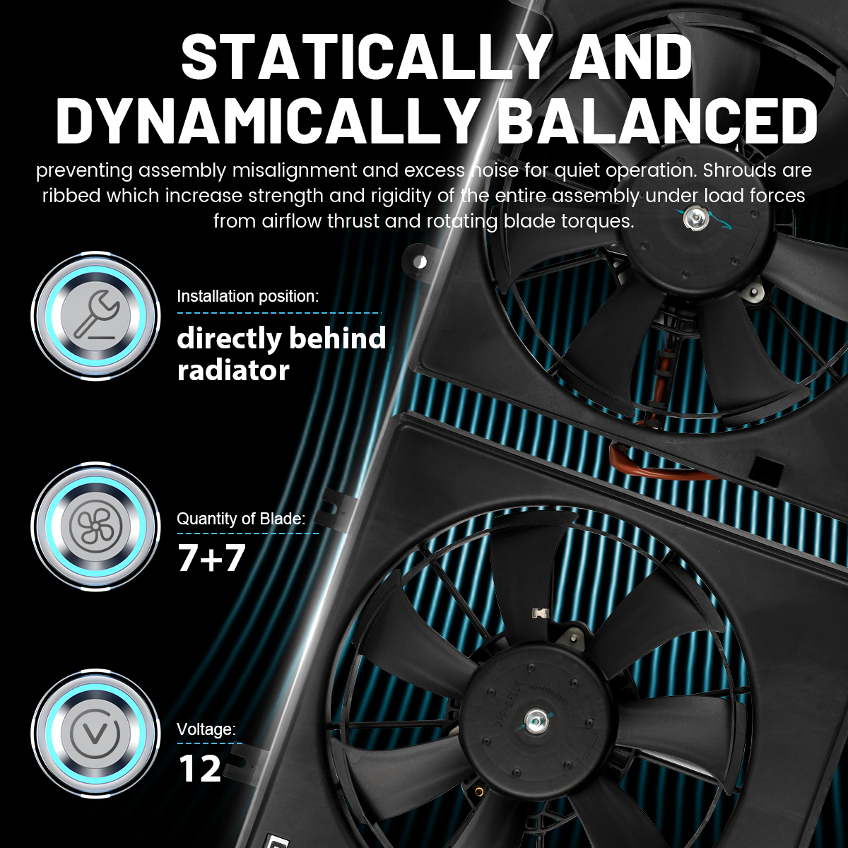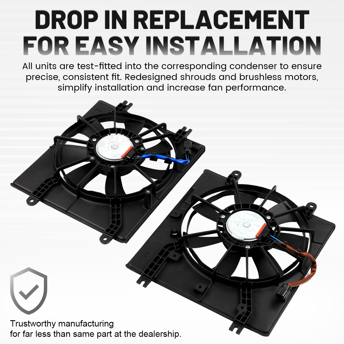 1.Drop in replacement for easy installation.All units are test-fitted into the corresponding condenser to ensure precise, consistent fit. Redesigned shrouds and brushless motors, simplify installation and increase fan performance.