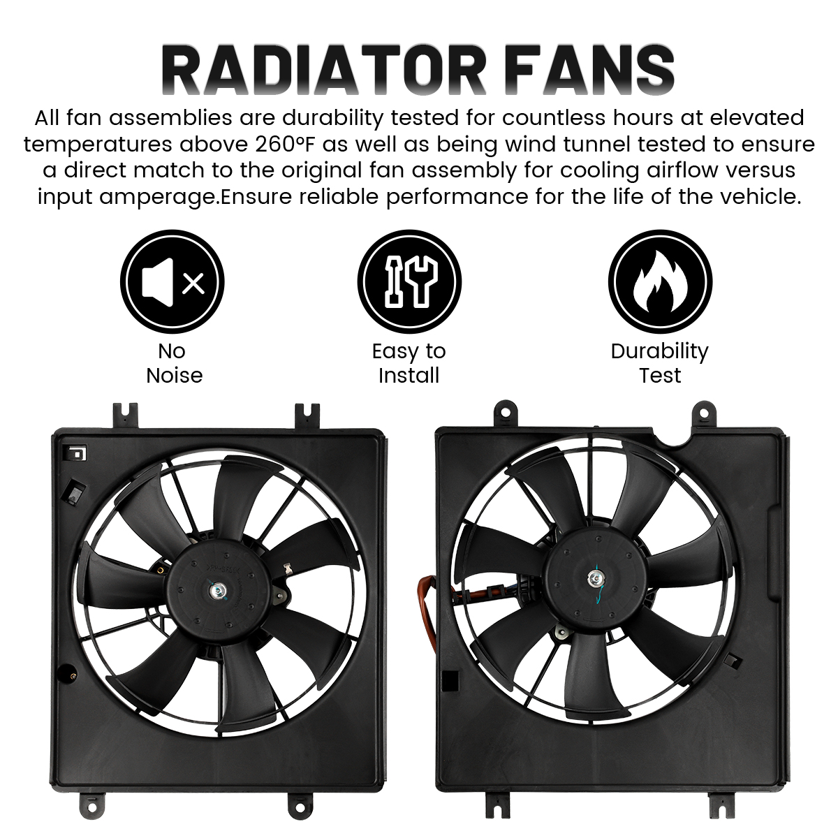 4.All fan assemblies are durability tested for countless hours at elevated temperatures above 260°F as well as being wind tunnel tested to ensure a direct match to the original fan assembly for cooling airflow versus input amperage.Ensure reliable performance for the life of the vehicle.
