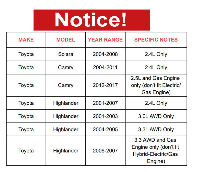 3.3 AWD and Gas Engine only (Don’t fit Hybrid-Electric/Gas Engine) |