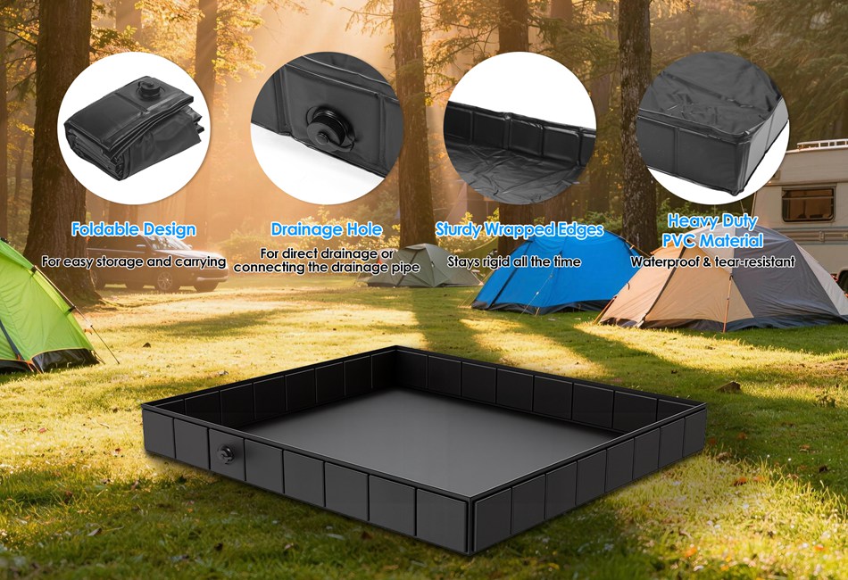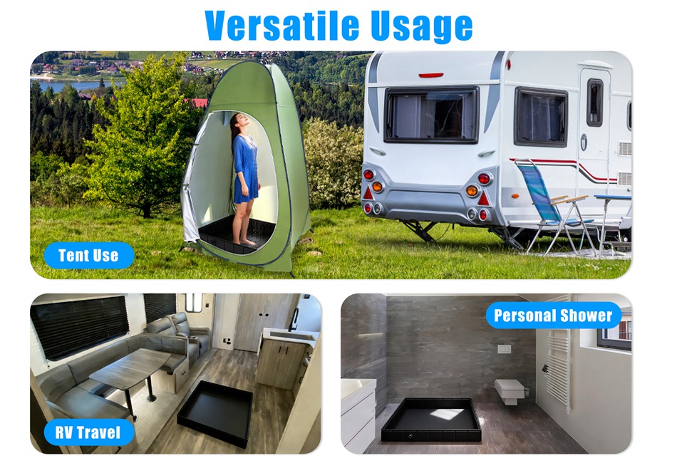 Create Your Outdoor Shower Anywhere, Anytime! Simply unfold this portable shower pan to a roomy 41-inch square base for a comfortable standing wash, then fold it down to a compact size for easy storage and transport. Made of sturdy, waterproof PVC, it includes a detachable drainage hose for simple water management. Weighing just 3.2 lbs, it’s the ultimate lightweight solution for camping, beach trips, RV use, and outdoor adventures. Stay clean on the go—order today!