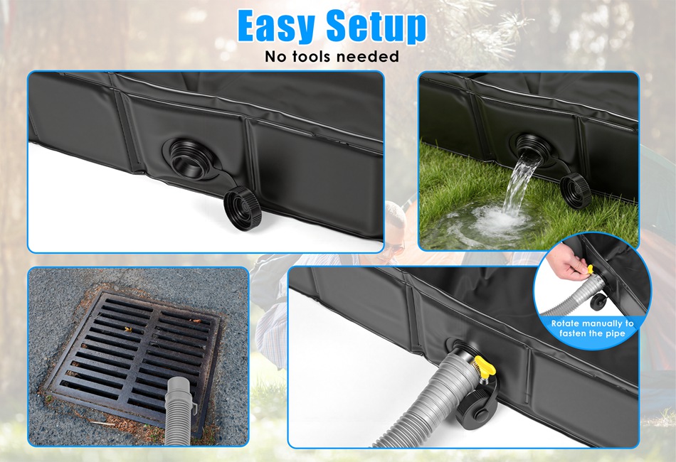 - Efficient Drainage System:Includes a detachable 3.28-foot drainage pipe with a secure buckle connection for controlled water flow and easy wastewater management. Simply attach the pipe to direct water away from your washing area.