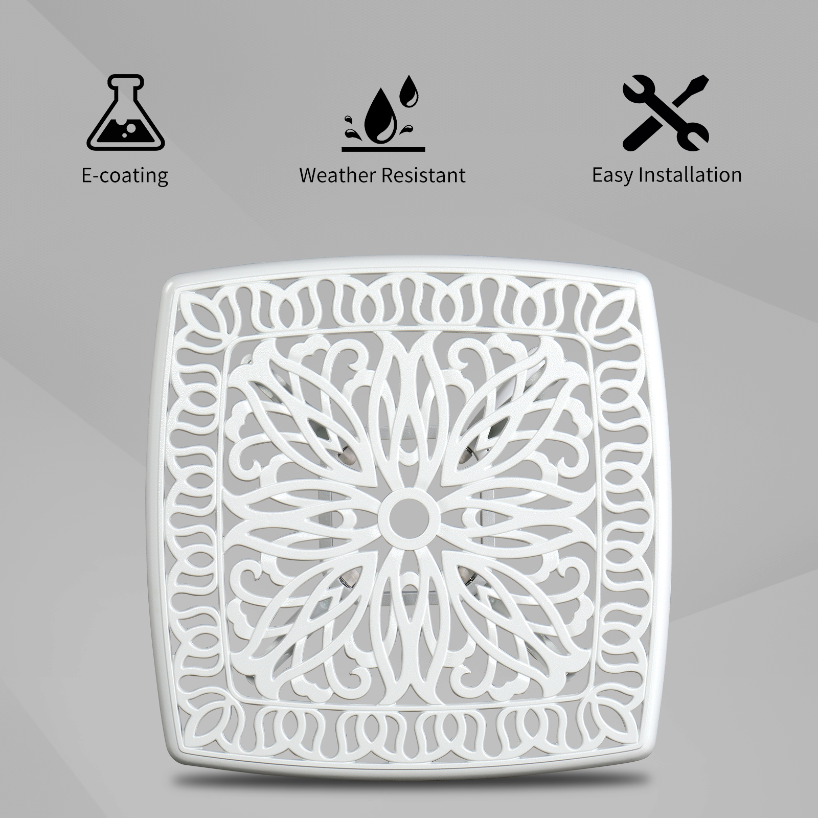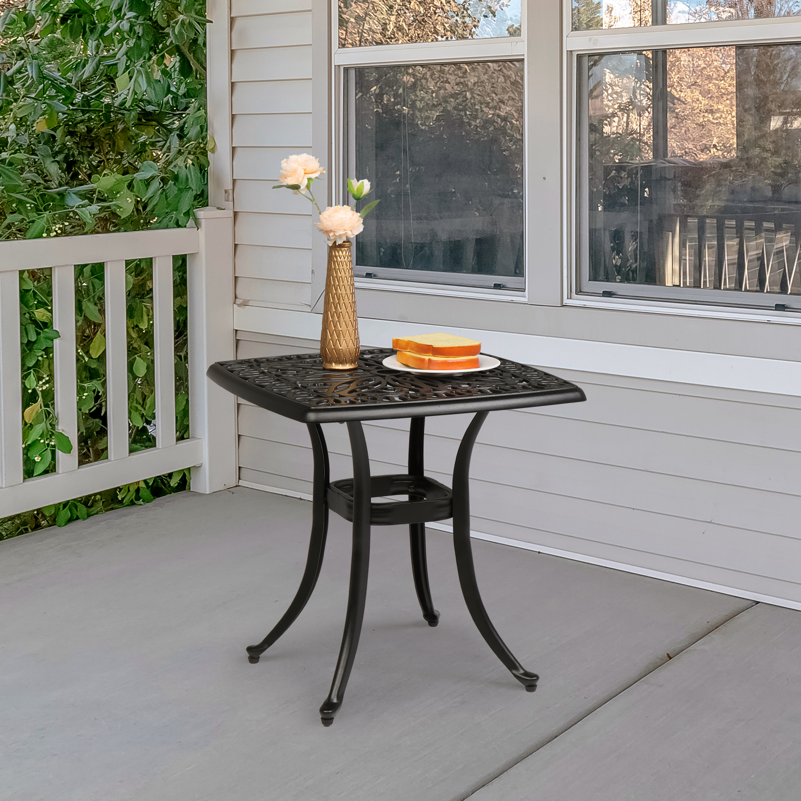 Experience the perfect blend of elegance and durability with the Outdoorr Cast Aluminum Square Table. Designed with a taste for classic styles, this black square table enhances any patio, garden, or balcony setting. The intricately designed tabletop showcases a timeless openwork floral pattern, adding a touch of nobility and vintage charm. This versatile piece can be used as an end table, side table, cocktail table, or even as a chic outdoor bar table, making it ideal for hosting gatherings or simply enjoying a peaceful outdoor moment.