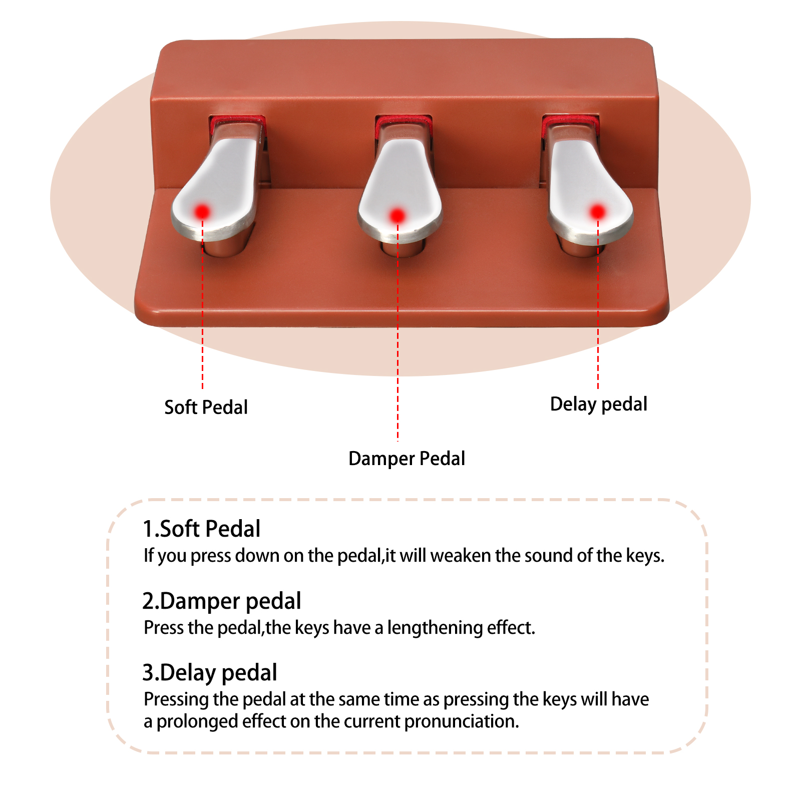 4. 3 Pedal System:Soft pedal-Soften the tone;Sustain pedal-Continuously increasing lengths of sustained notes,from slight to full;Sostenuto pedal-Press the pedal halfway down to get a partial damper effect