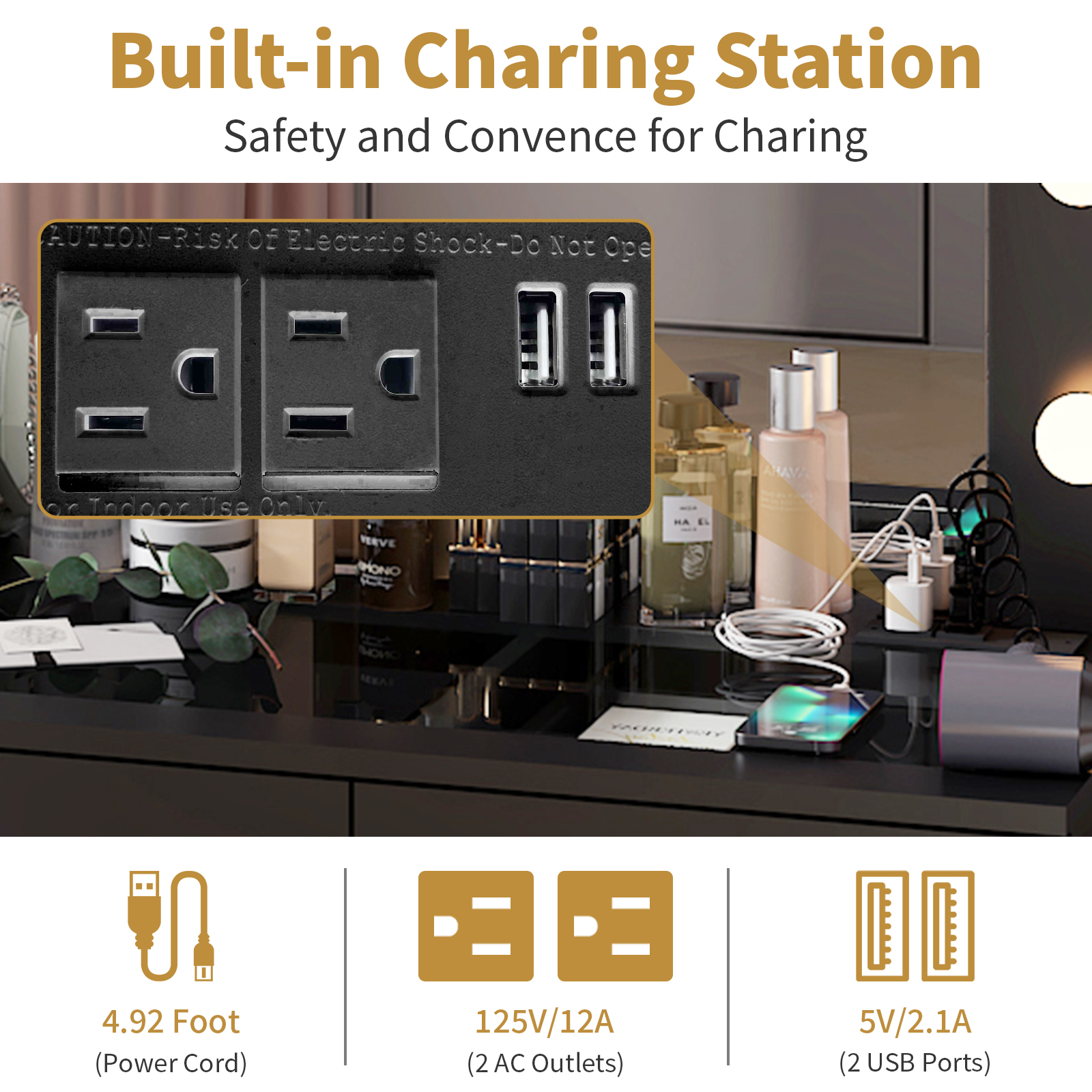 4. Convenient Charging Station with USB Ports: The built-in power strip includes 2 standard plug sockets and 2 USB ports, making it easy to charge your devices or use your hair dryer and curling iron while seated at your vanity.
