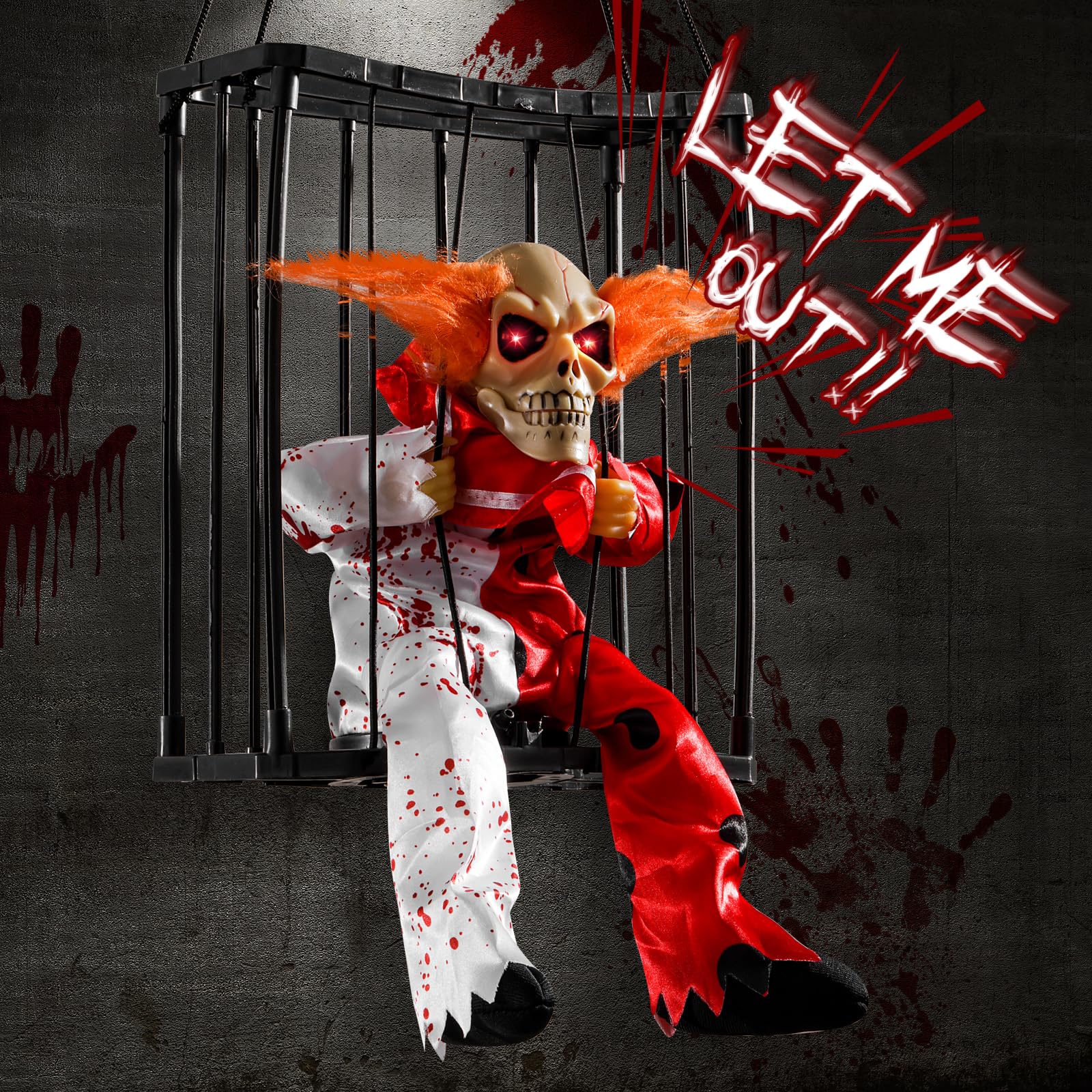 Funny Scary Halloween Decor:Definitely will freak your friends out when they go by and trigger this animated Halloween decor. The red eyes caged prisoner will pop his head out while screaming“Ah,Help!” "let me out of here", "didn't your mama ever tell you it's rude to stare"