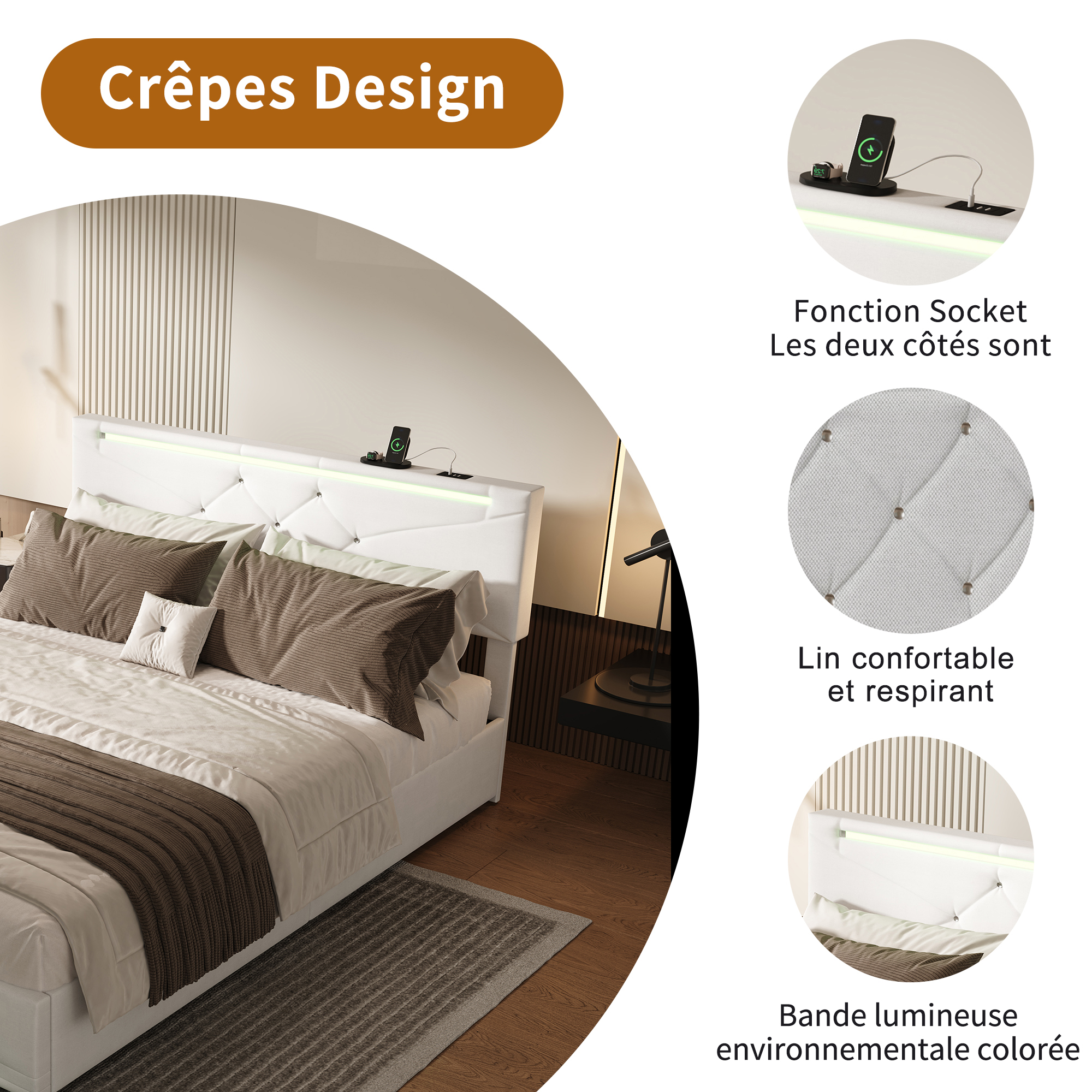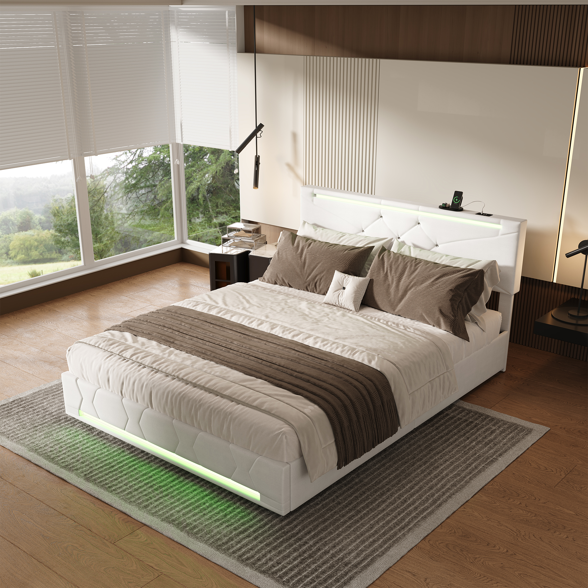 Verwandeln Sie Ihr Schlafzimmer in eine multifunktionale Wohlfühloase: Dieses hochwertige Doppelbett vereint atemberaubende Lichteffekte, intelligente Ladetechnik, maximalen Stauraum und robuste Stabilität – perfekt für Paare, moderne Haushalte und alle, die Komfort mit High-Tech verbinden möchten.