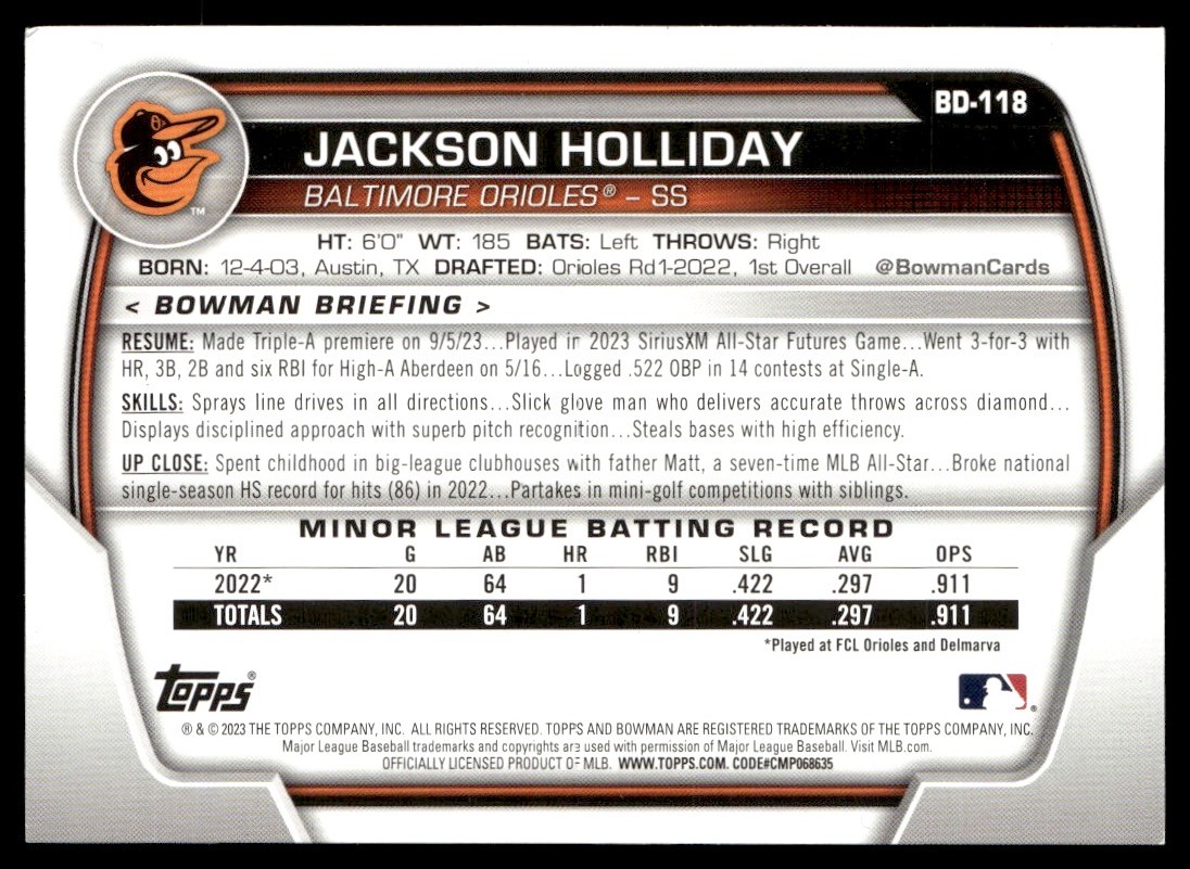 2023 Bowman Draft Jackson Holliday Rookie Baltimore Orioles #BD-118