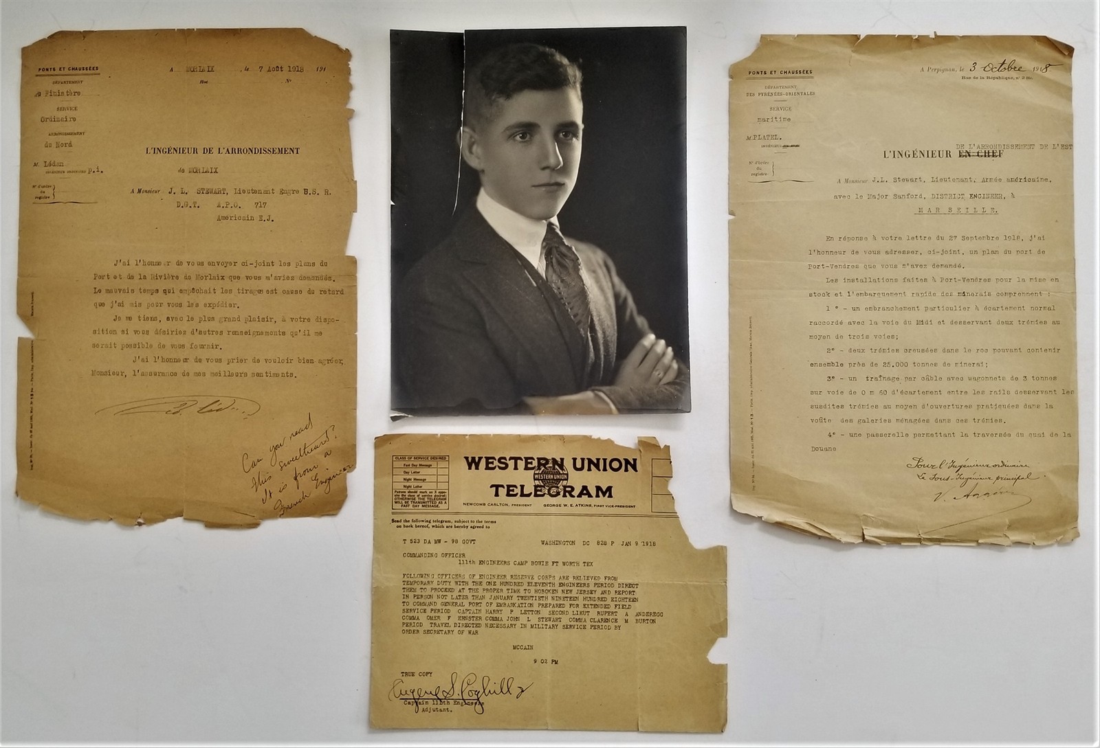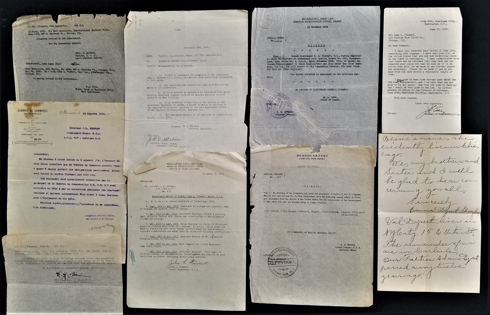 This listing is for the Collection of 23 documents related to the World War I service of John L Stewart, 2nd Lieutenant, Engineers of the American Expeditionary Forces.