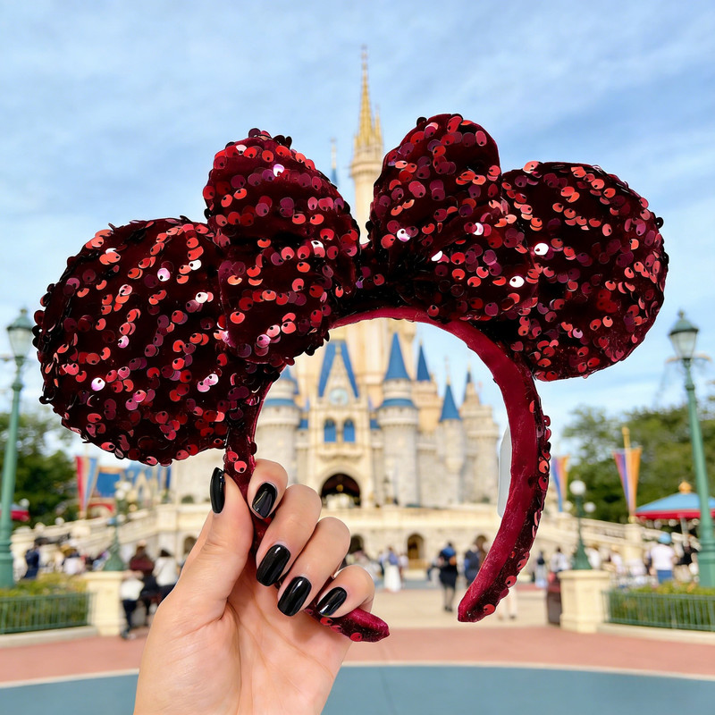 Velour Dark Red Sequins Disney` Park Headband Mickey Ears Disneyland Tokyo