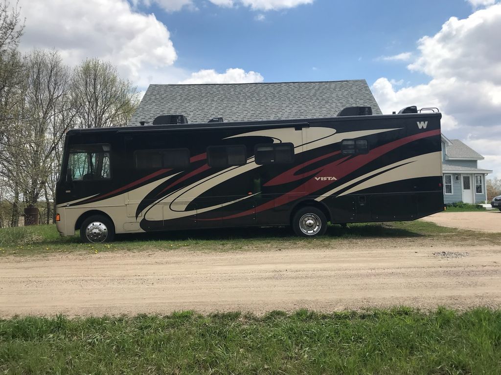 2012 Winnebago Vista LX 35F Well Maintained Class A Motorhome This 2012 Winnebago Vista LX 35F is a well-maintained Class A motorhome powered by the dependable Ford V10 6.8L gas engine. With 83,714 miles (as of March 2026), this coach has received extensive maintenance and upgrades over the past several years and is ready for the road. The Vista LX 35F offers a spacious and comfortable layout featuring two slide-outs (living room and master bedroom), two bathrooms, and beautiful cherry wood cabinetry and trim throughout. The rear master bathroom includes a 32" x 31" shower, while the half bath adds convenience for guests. Entertainment features include three TVs (living room, bedroom, and exterior) and a CD/radio sound system. Key Features Ford V10 6.8L Gas Engine 83,714 miles Two slide-outs Two bathrooms Cherry wood cabinetry Full body paint (7 layers) 22,000 lb chassis frame rating Three TVs (LR, bedroom, exterior) Complete owner manuals Automatic Leveling jacks Mechanical & Maintenance Updates Safe-T-Plus steering stabilizer (2021) Three house batteries replaced (2025) 6 New Sumitomo tires tires (2022) Onan generator 5000 W, 927 hours, oil and filter changed regular Two slide-out systems repaired (2023) Engine, oil and filter, radiator flush Brake service and drive train, regularly maintained All Fogged windows have been replaced (2020)